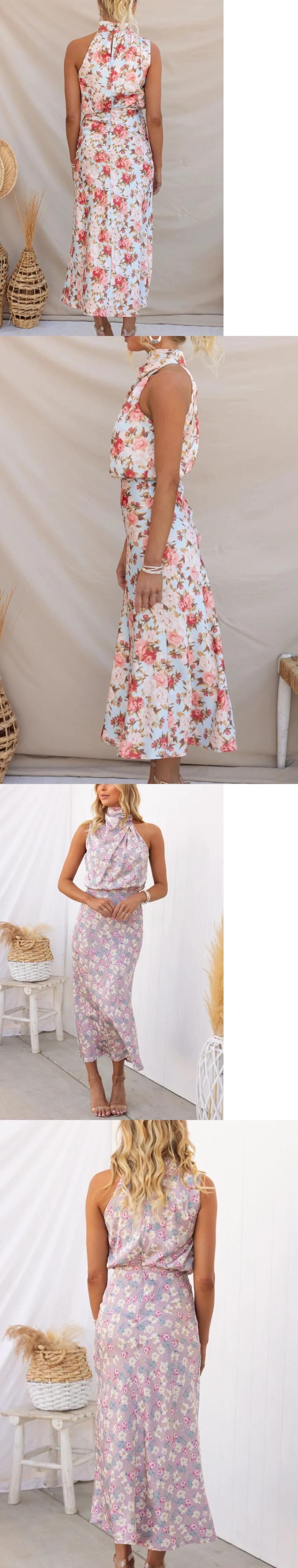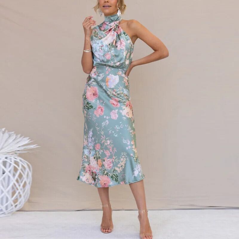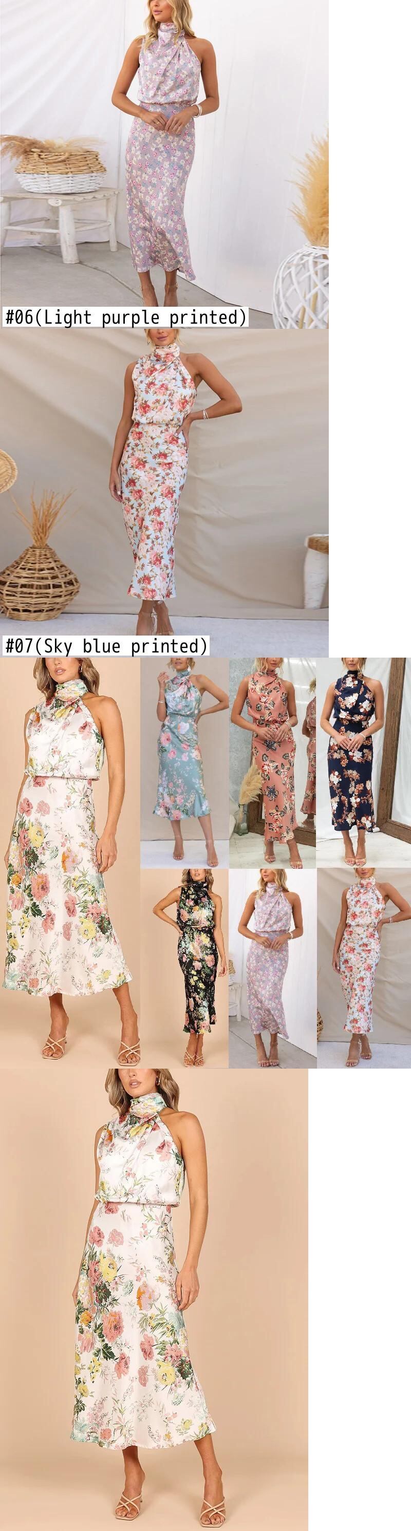 送料無料 夏のサテンドレスホルターセクシーなドレスノースリーブプリント花柄パーティー A ラインヴィンテージイブニングロングドレス女性ローブ 25768 サマー 夏物 Aライン ビンテージ AE665656643423497081