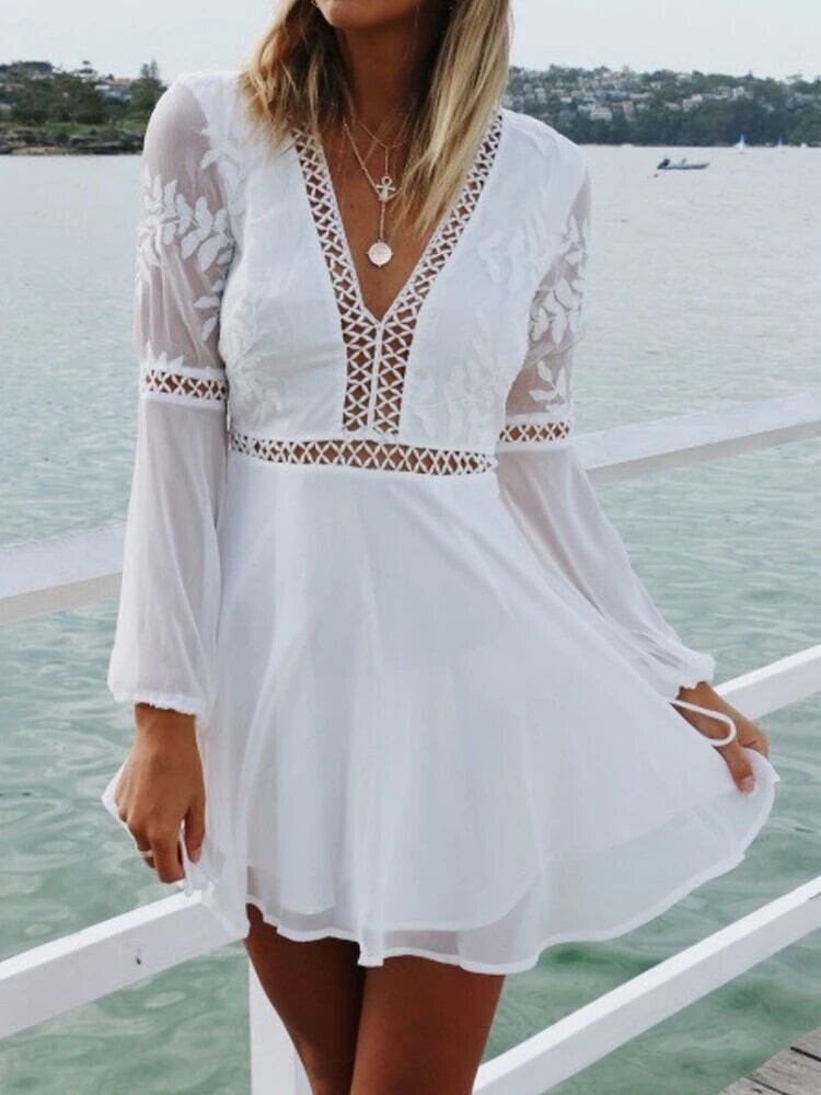 送料無料 2023 長袖ビーチドレスセクシーな白い背中の開いたレースドレス夏の V ネックの女性中空アウトショートドレスレースアップ 24851 ロング ホワイト サマー 夏物 Vネック AE665656687222458530