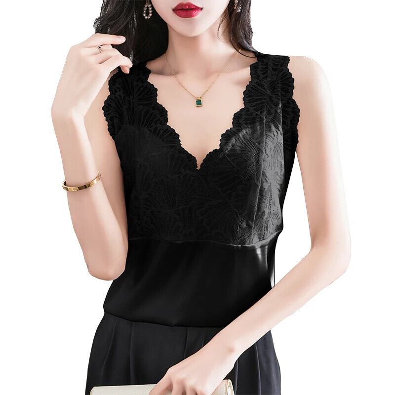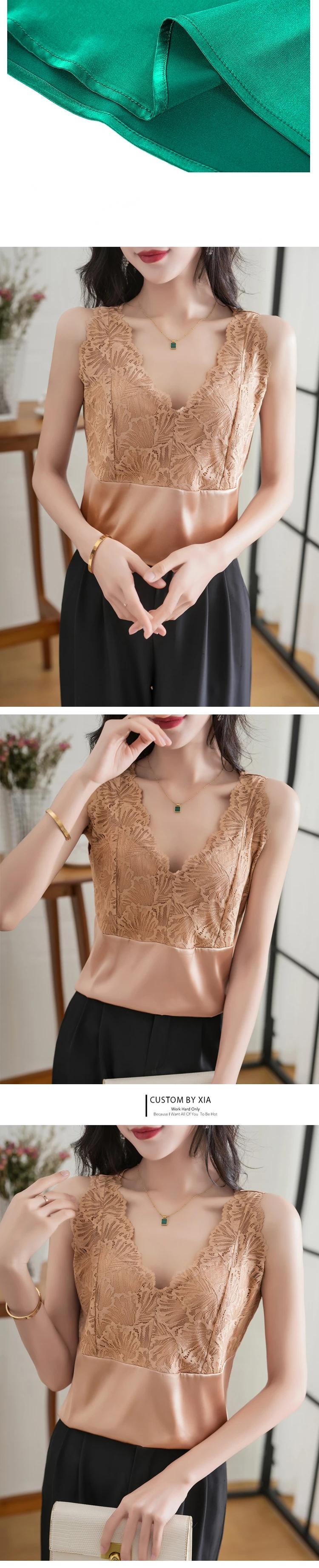 送料無料 2023 ルーズシャツ夏の女性のレースブラウス V ネック固体サテントップシルクノースリーブユースベスト 25517 サマー 夏物 Vネック ソリッドカラー AE665656664348162113