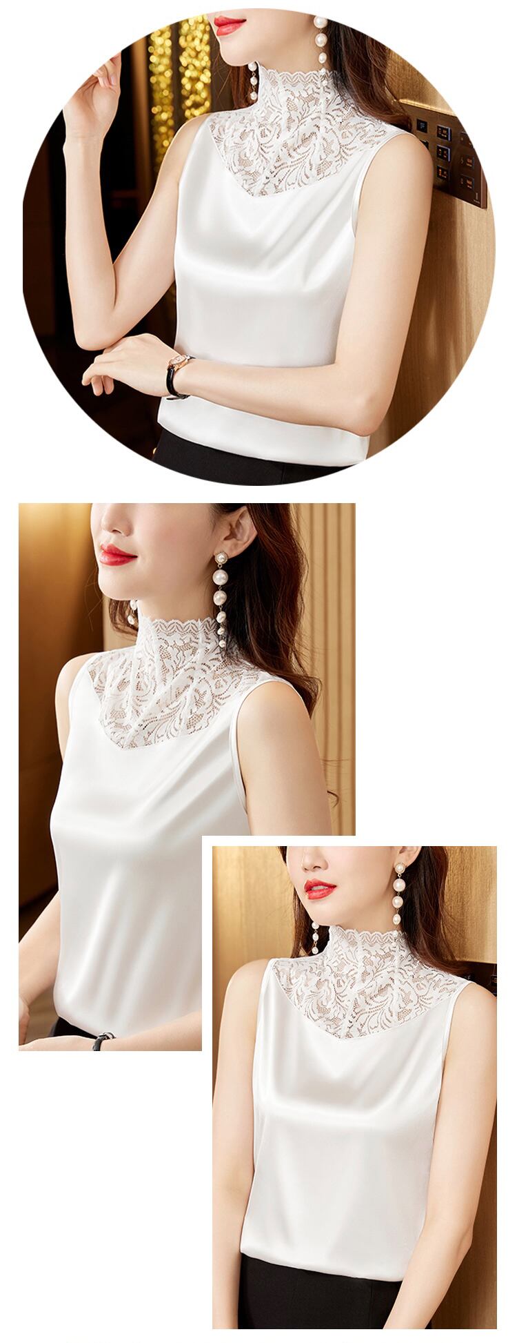 送料無料 ノースリーブシャツ女性レースタートルネックサテンブラウスルーズ中空アウトセクシーなトップベストシルク 26087 AE665656650953893203
