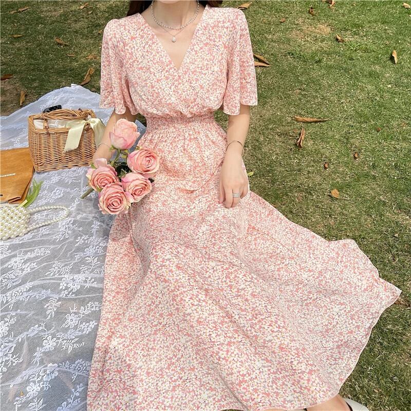 送料無料 V ネック半袖パーティードレス夏背中の開いたシフォン花柄ドレス女性のセクシーなロングドレスローブ 25487 ショート ハーフスリーブ サマー 夏物 Vネック AE665656670396455042