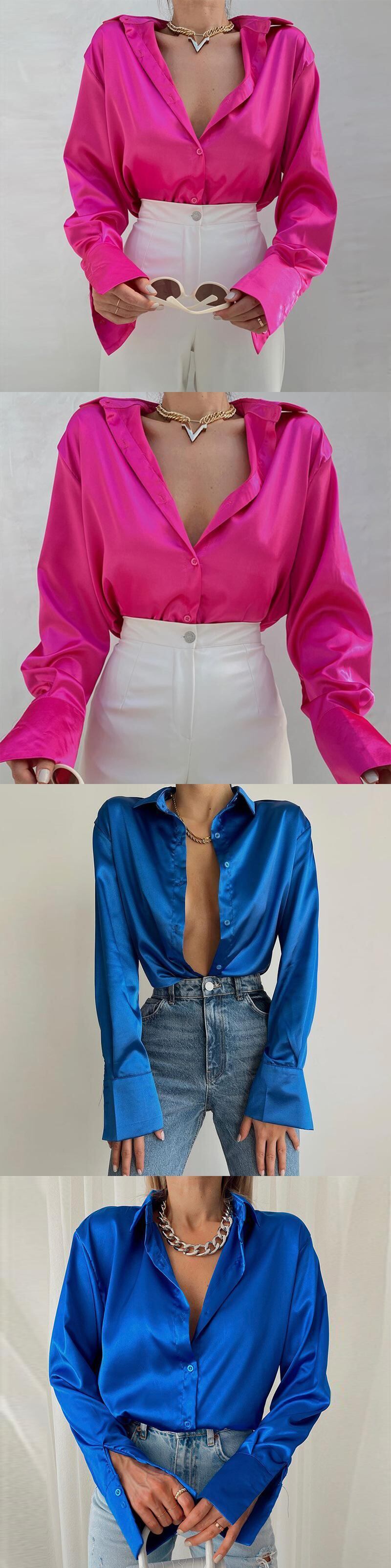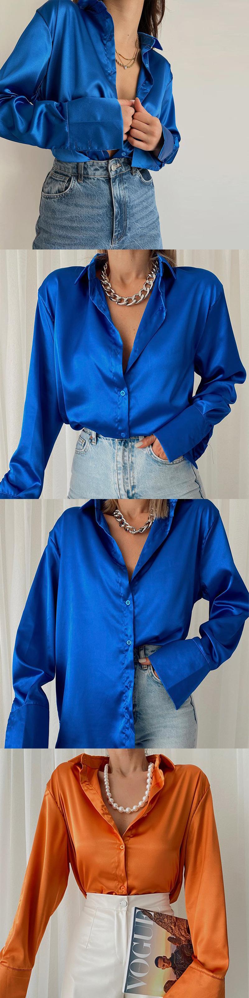 送料無料 サテン長袖ブラウス女性 2023 ヴィンテージブルーグリーンシルクシャツ女性ルーズボタンアップシャツトップス 18913 ロング ビンテージ AE665656623841715034