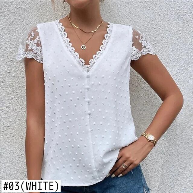 送料無料 夏 V ネックレース白シャツヴィンテージ固体服半袖ルーズ刺繍ブラウス女性トップス 25714 ショート ホワイト ハーフスリーブ サマー 夏物 Vネック ソリッドカラー ビンテージ AE66565662982587666 | 女性の為の通販サイト-fashion navi