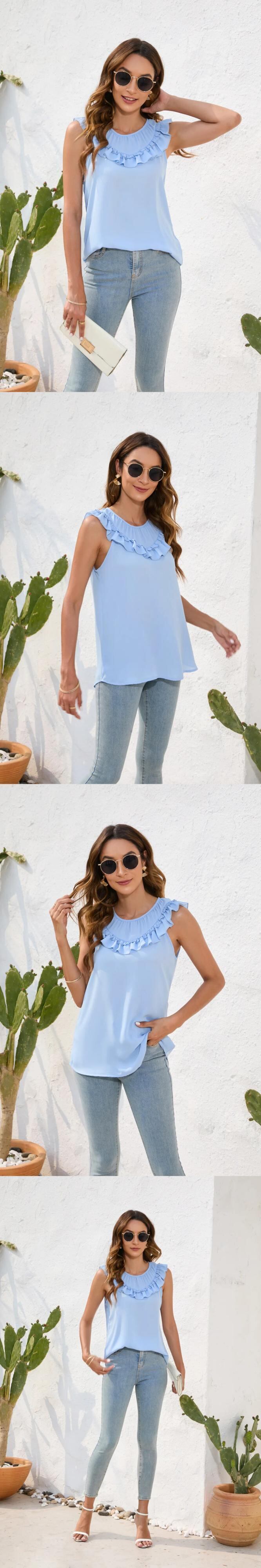 送料無料 女性の夏シフォンシャツとブラウス 2023 ノースリーブトップススタイリッシュな固体フリル 26537 ラッフル サマー 夏物 ソリッドカラー AE665656694761908764
