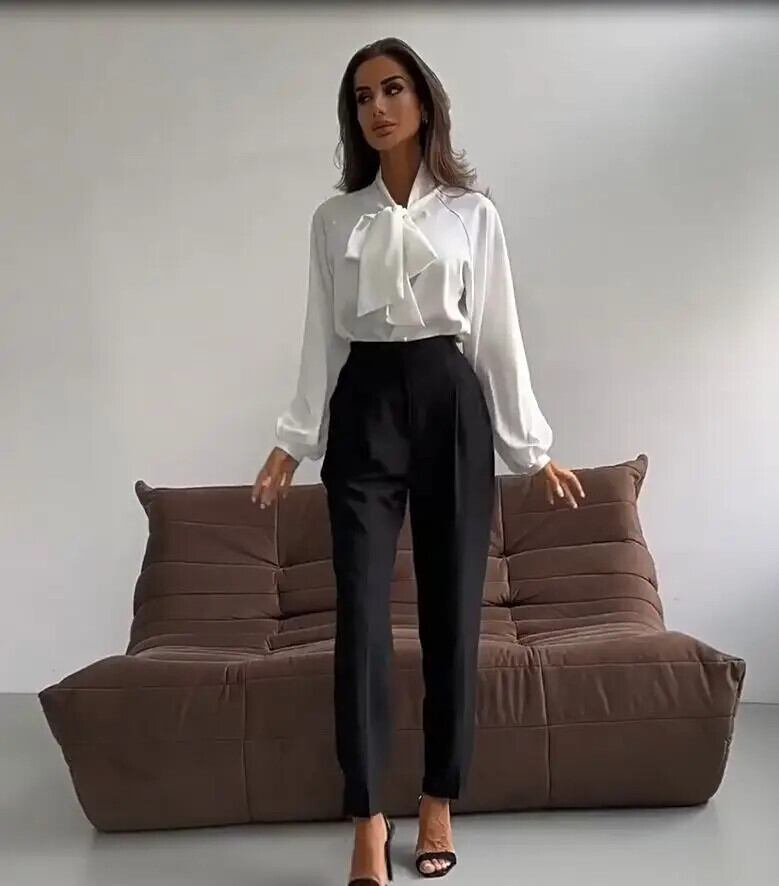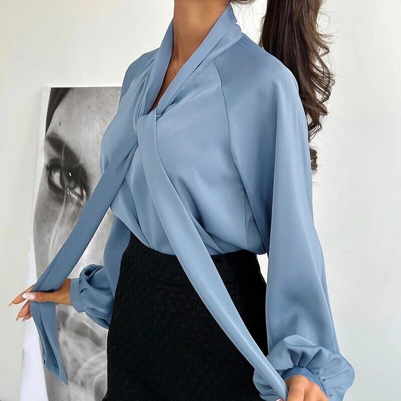 送料無料 長袖シャツ フレンチ スタイル ボウカラー トップス オフィス レディー 無地 ブラウス 秋 ゆったり 服 28875 ロング リボン オータム 秋物 ソリッドカラー 会社 学校 通勤や通学にも AE665656631394114794