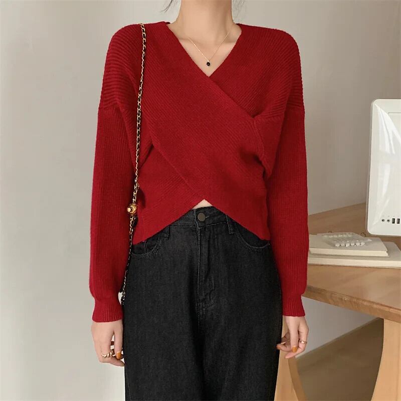 送料無料 ヴィンテージプルオーバーセーター女性秋 2023 ルーズ V ネック女性ニットトップス冬クロス不規則なジャンパー 28576 オータム 秋物 ウィンター 冬物 Vネック ビンテージ AE665656652777599429