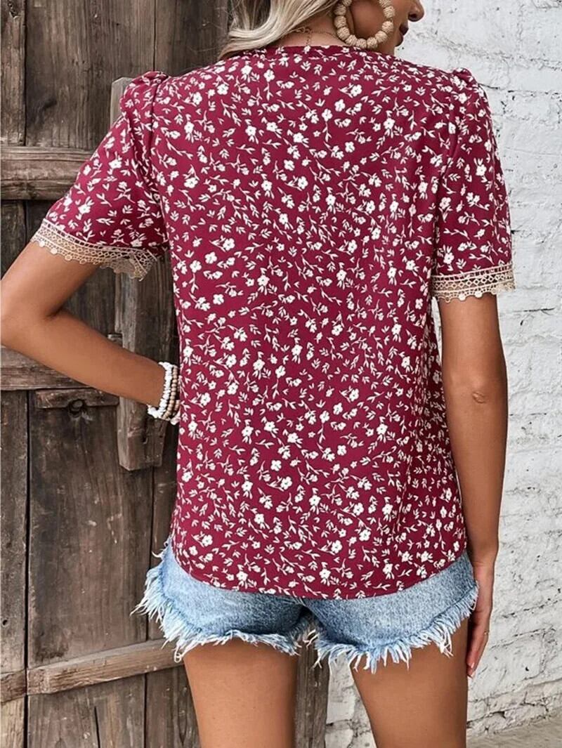 送料無料 2023 V ネックシャツ夏プリント花レースブラウス女性ルーズ半袖トップシック 25995 ショート ハーフスリーブ サマー 夏物 花柄 Vネック AE665656683518089673