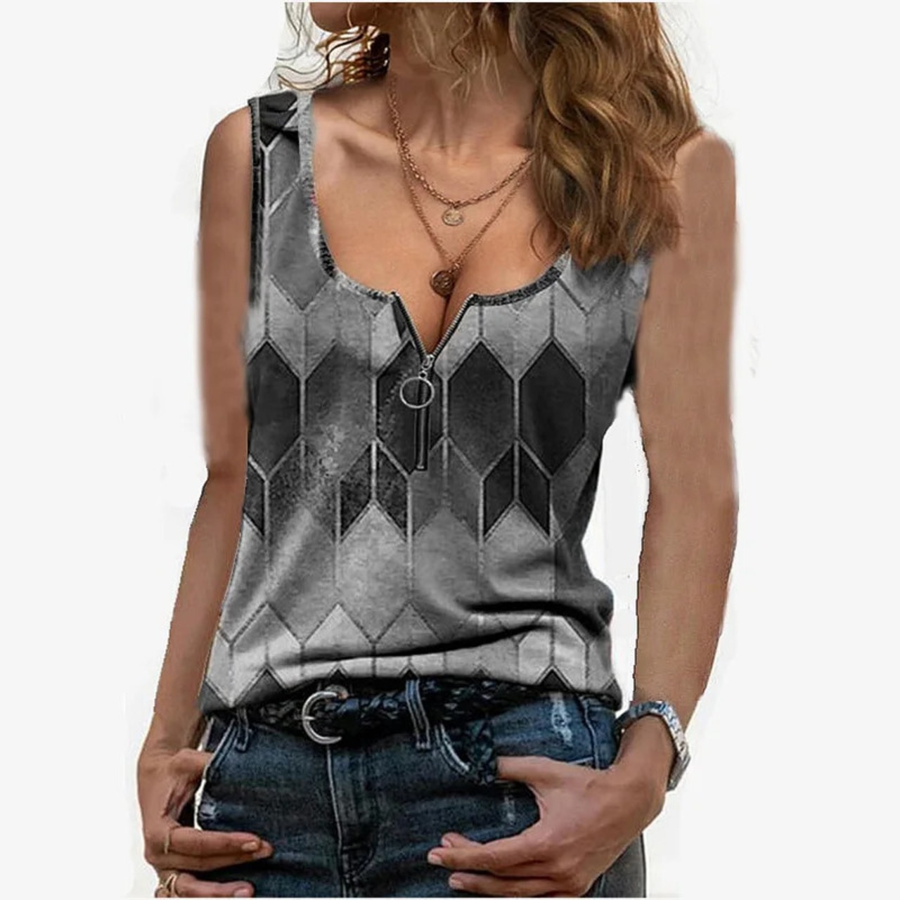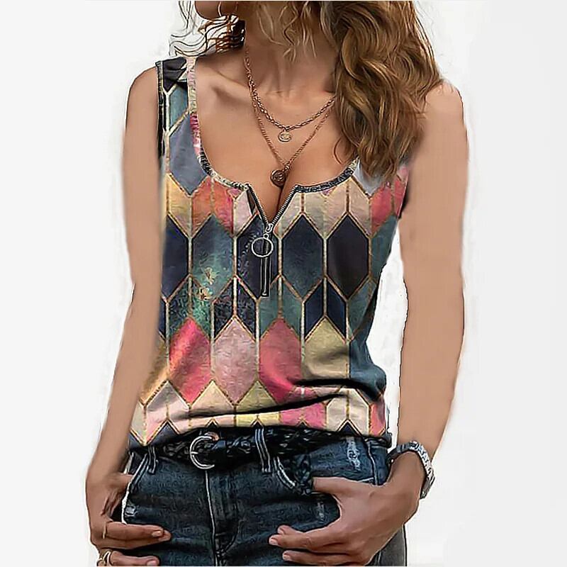 送料無料 夏の女性のノースリーブベストトップジッパー幾何学プリント Tシャツ V ネックプルオーバーブラウスルーズ 25187 サマー 夏物 Vネック AE665656678372308803