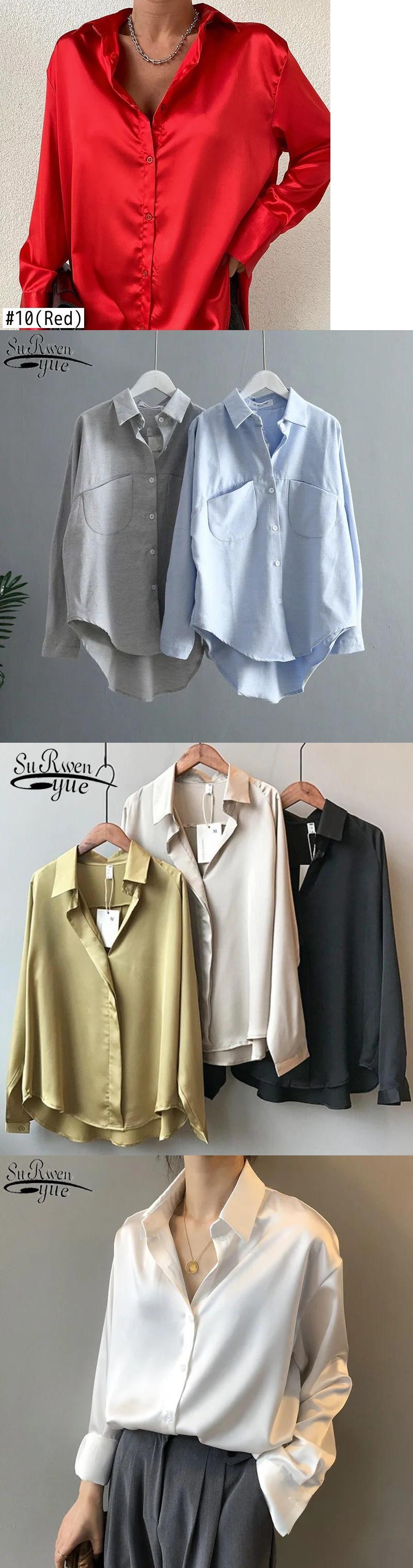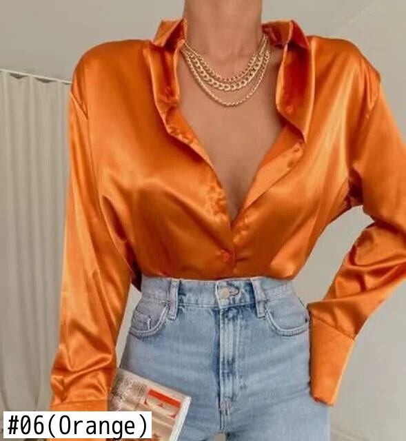 送料無料 2023 シルクシャツ女性固体ルーズオフィスレディトップス春ボタン長袖サテンブラウス服 22717 ロング スプリング 春物 ソリッドカラー 会社 学校 通勤や通学にも AE665656616200774089