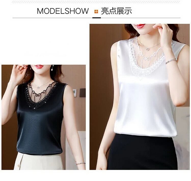 送料無料 レーススパンコールトップ夏の女性ノースリーブサテンブラウスルーズユースシャツシルク25216 サマー 夏物 AE665656647675323168