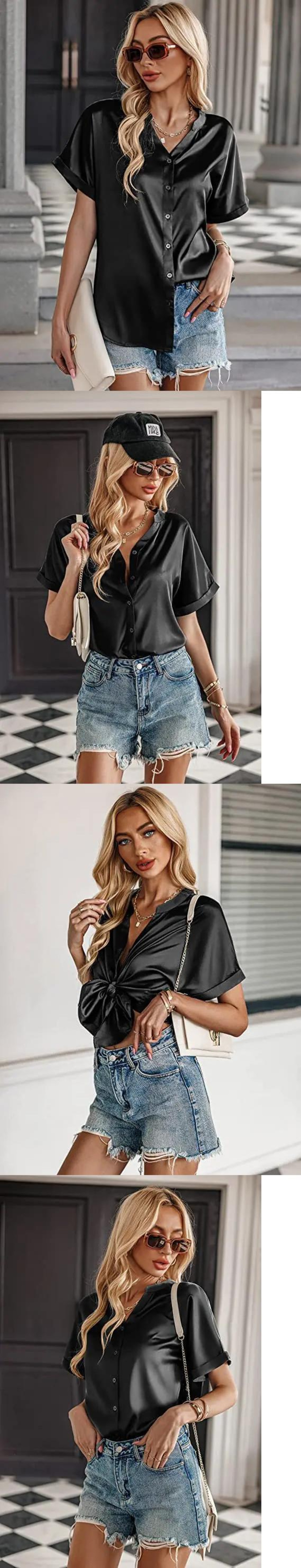 送料無料 女性ボタン半袖シャツ夏固体サテンシルクブラウス女性ブラウス V ネックトップス Blusa 24907 ショート ハーフスリーブ サマー 夏物 Vネック ソリッドカラー AE665656613722938519