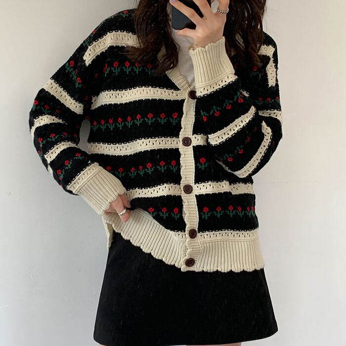 送料無料 秋中空アウトフラワープリントカーディガン女性セータールーズニットトップススタイル甘いクールニット 29159 大人ガーリー スウィート キュート カジュアル オータム 秋物 フラワーデザイン AE665656672674949961