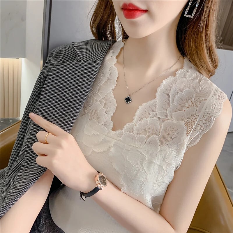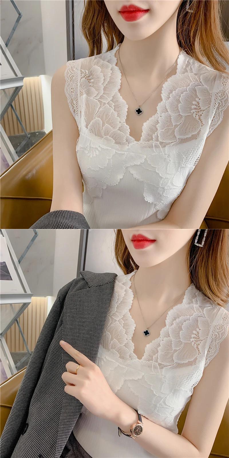 送料無料 2023 夏黒のセクシーな V ネックフラワーレースブラウスシックなトップノースリーブニットシャツスリム若者服 25381 ブラック サマー 夏物 Vネック フラワーデザイン AE665656612167056996