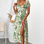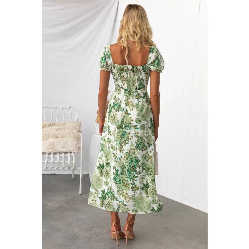 送料無料 2023 パフスリーブスリムセクシーなプリント V ネックスプリットロングドレス女性の夏のシフォングリーンドレスローブ 25530 サマー 夏物 Vネック AE665656699612386112