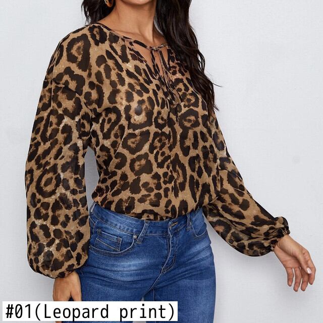 送料無料 O ネックレースアップシフォンシャツヒョウ柄トップスヴィンテージ服気質通勤オフィスルーズシャツ 25810 プリント Oネック ビンテージ 会社 学校 通勤や通学にも AE665656679168316014