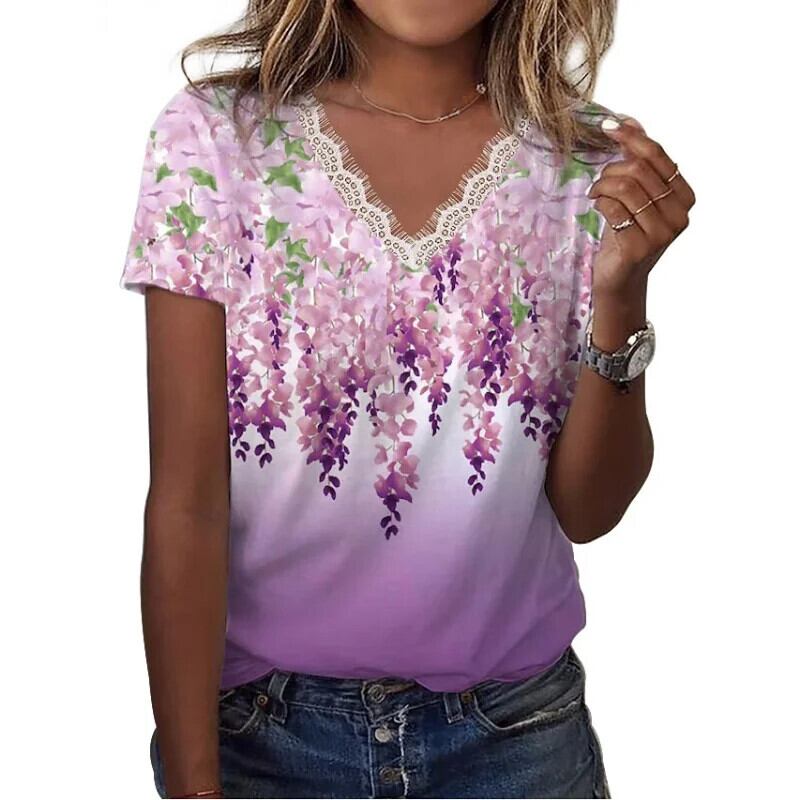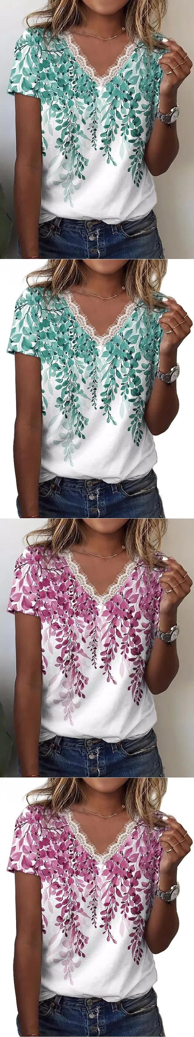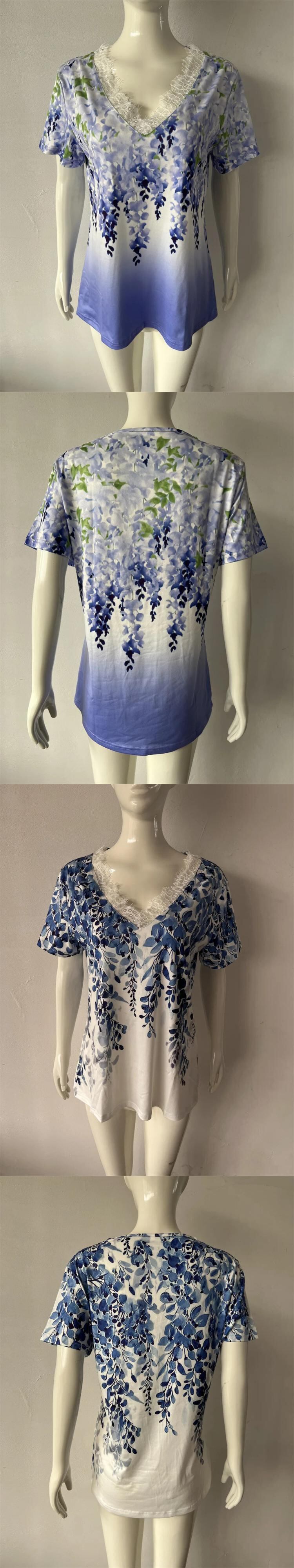 送料無料 夏の女性のフラワープリントブラウスルーズ V ネックレースシャツ半袖トップ春 Tシャツ 26041 ショート ハーフスリーブ スプリング 春物 サマー 夏物 Vネック フラワーデザイン AE665656664651341167