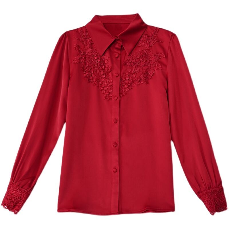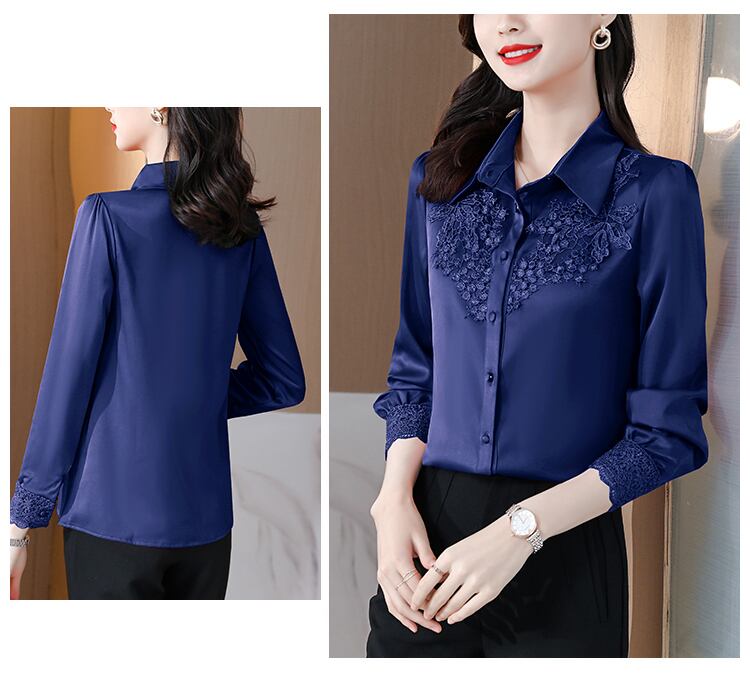 送料無料 刺繍女性長袖ブラウスレースサテンシャツボタンオフィスレディトップス固体 24636 ロング ソリッドカラー 会社 学校 通勤や通学にも AE66565669000922121