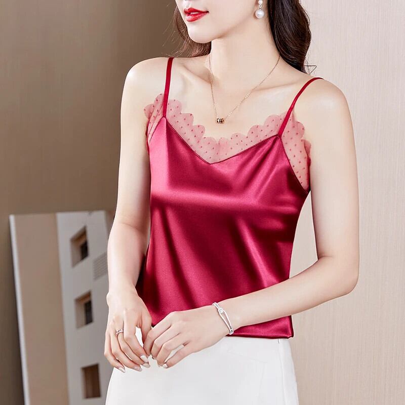 送料無料 ノースリーブレースセクシーな緩い服夏の女性のブラウス 2023 シルクシャツ女性タンクトップ blusas デ mujer 24900 サマー 夏物 AE665656614914984847