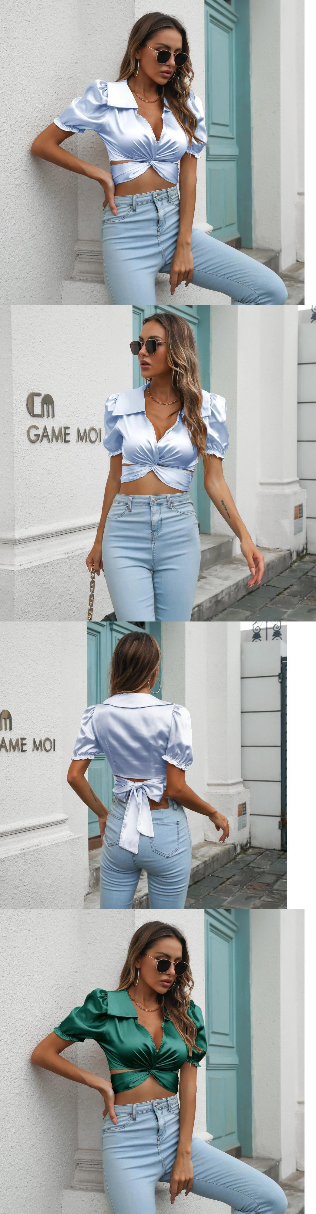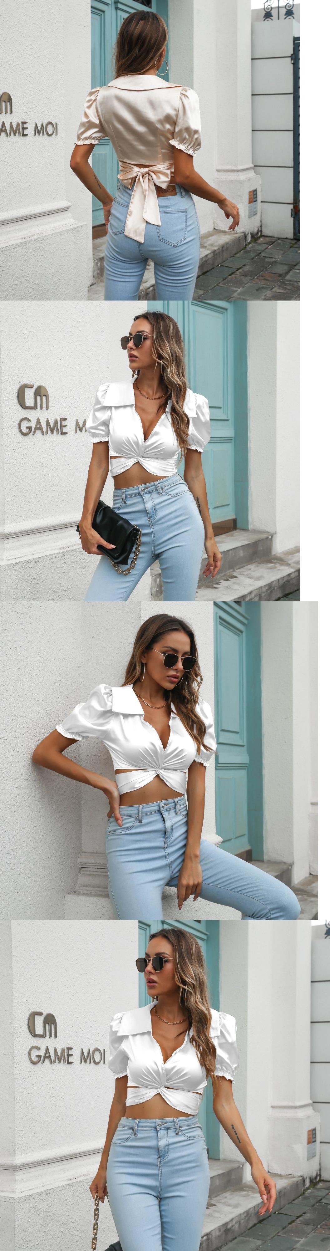 送料無料 夏 V ネックソリッドショートシャツ女性のセクシーなトップ 2023 サテンシルク半袖トップス 26108 ハーフスリーブ サマー 夏物 Vネック ソリッドカラー AE665656651502843024