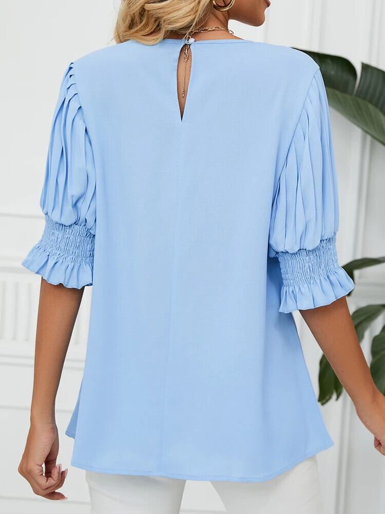 送料無料 夏フリルプリーツスリーブブラウス 2023 女性ソリッドカラーシャツラウンドネックルーズシフォントップス 25019 サマー 夏物 Oネック AE665656666542296787
