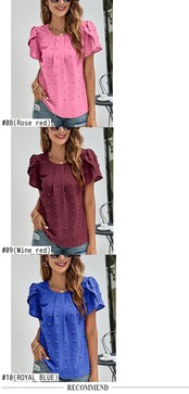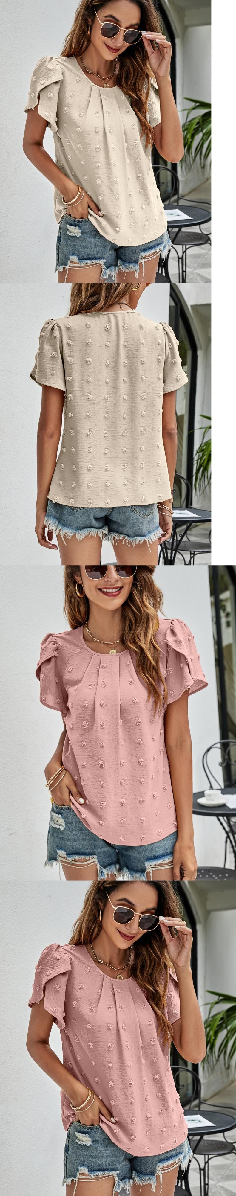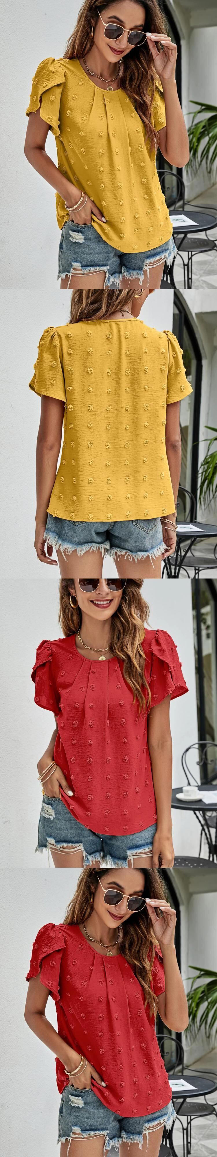 送料無料 2023 花びら半袖シャツジャカード女性の夏のブラウス O ネックルーズ女性ルーズトップス 25022 ショート ハーフスリーブ サマー 夏物 Oネック AE665656645506306818