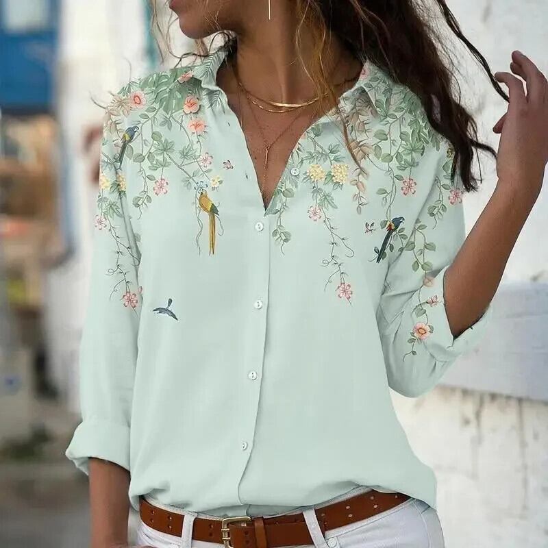 送料無料 女性ルーズブラウスヴィンテージプリント長袖シャツオフィスレディボタンアップシャツスタイリッシュなトップス 19783 ロング ビンテージ 会社 学校 通勤や通学にも AE665656681373332341