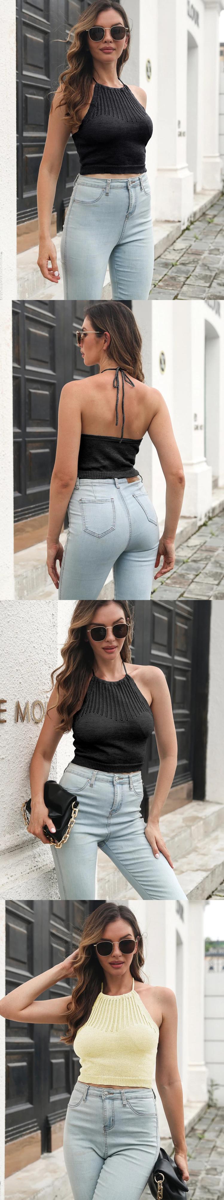 送料無料 セクシーな中空アウトホルター女性ニットブラウス 2023 夏ノースリーブニットシャツストリートショートクロップトップススリム 26413 サマー 夏物 AE665656640008262080 | 女性の為の通販サイト-fashion navi