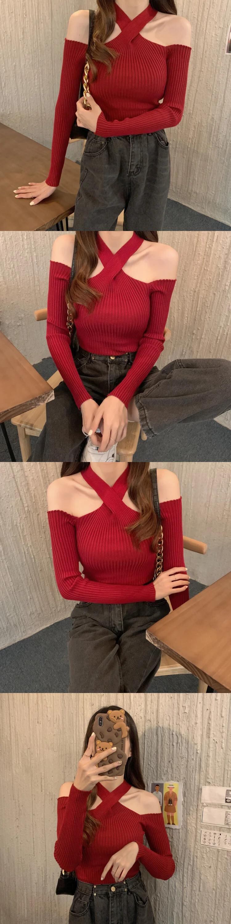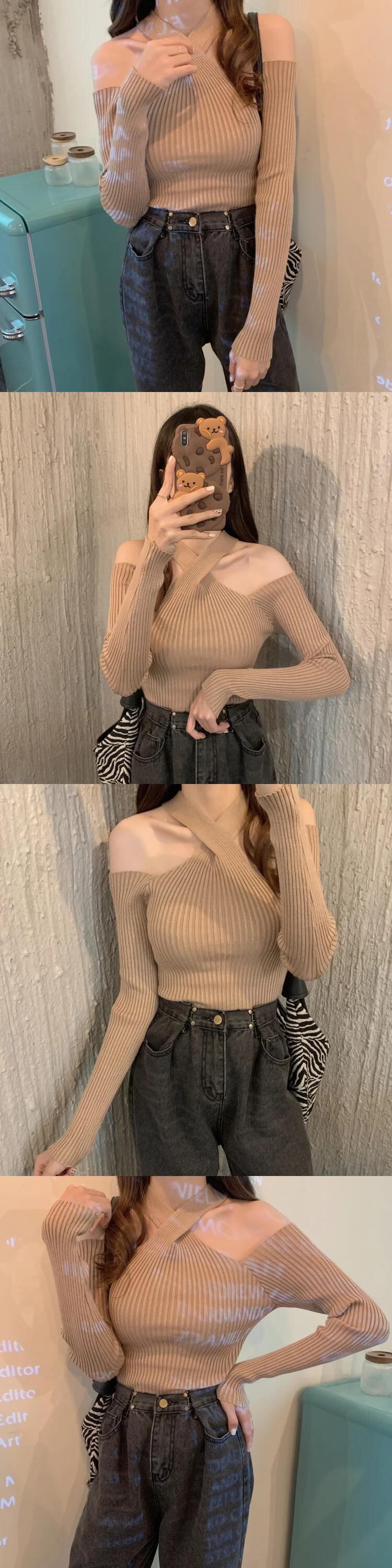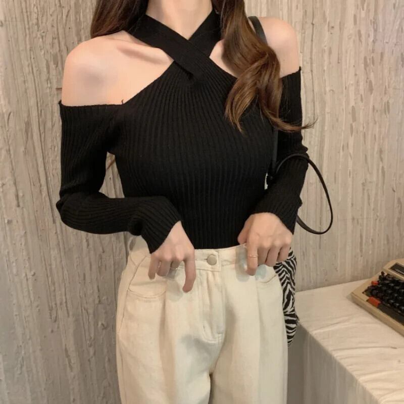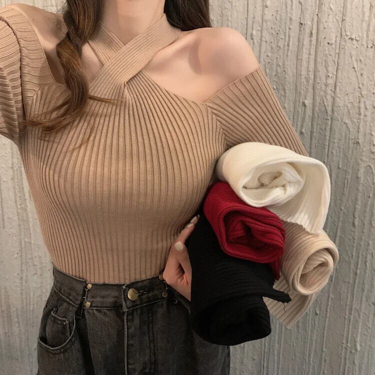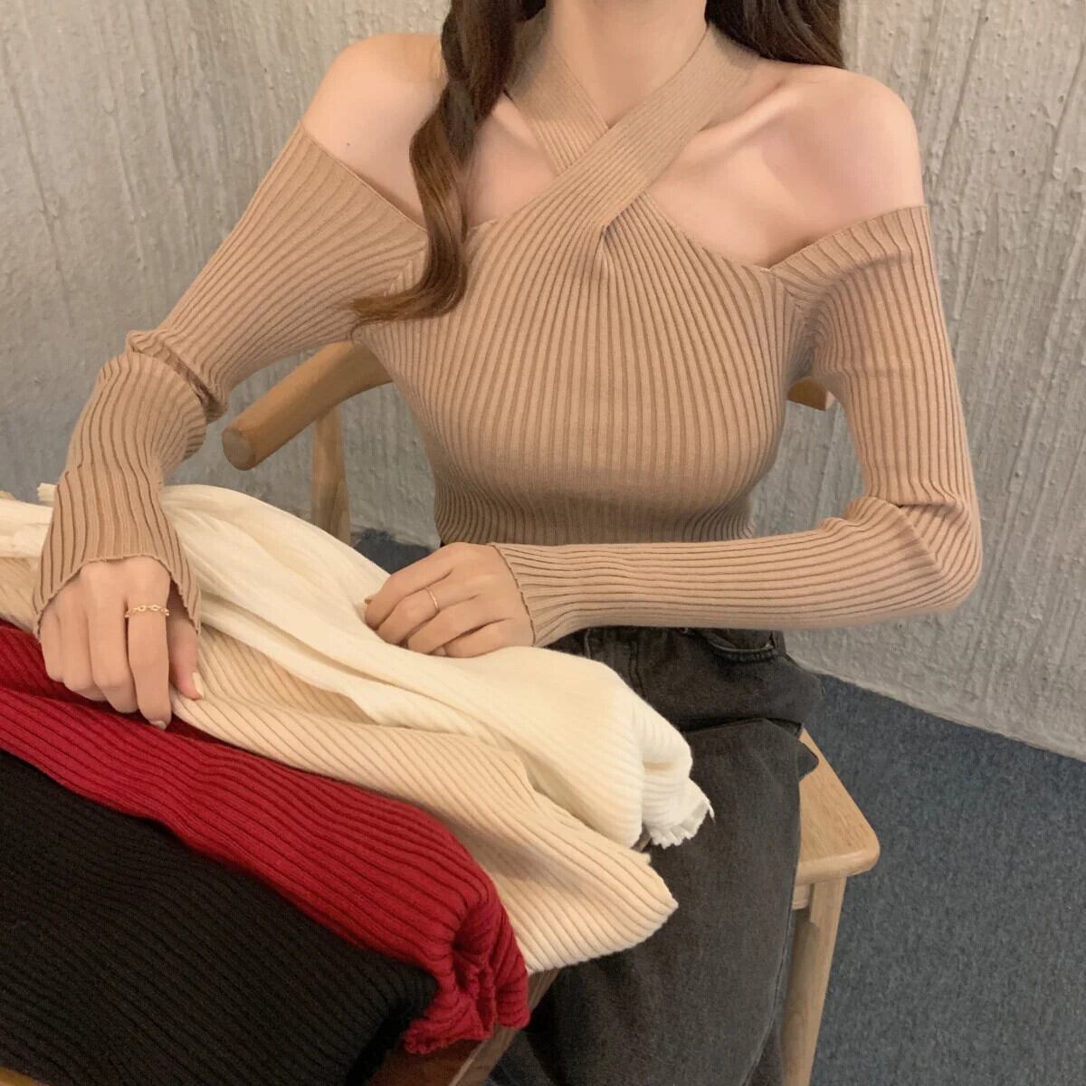 送料無料 秋のセクシーなオフショルダー長袖ニット女性セーター十字ホルターネック底トップスプルオーバー 28634 ロング オータム 秋物 AE665656634326788256