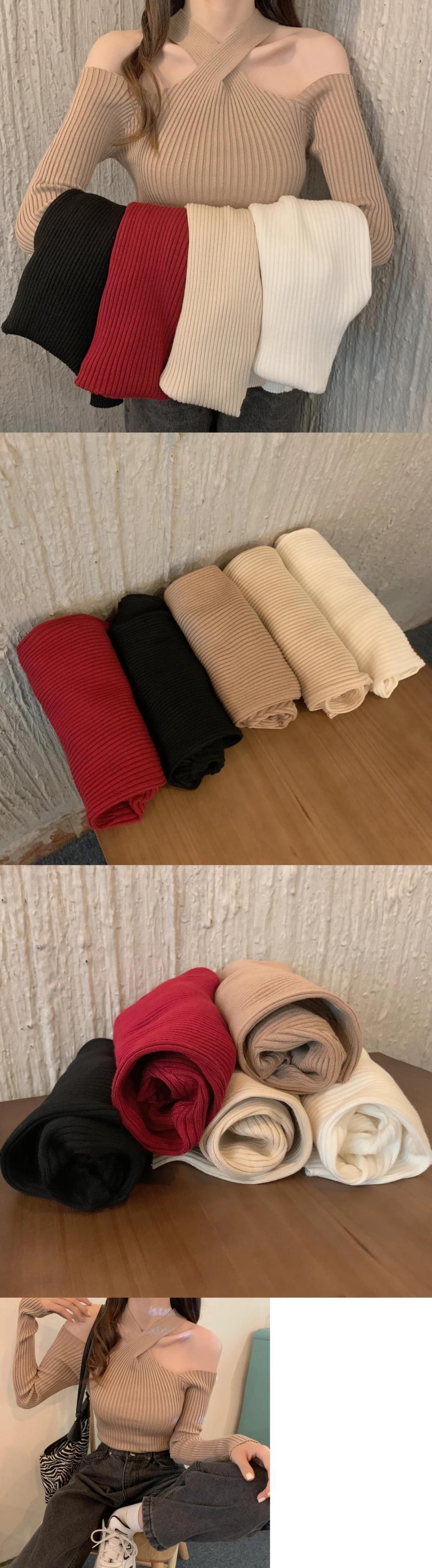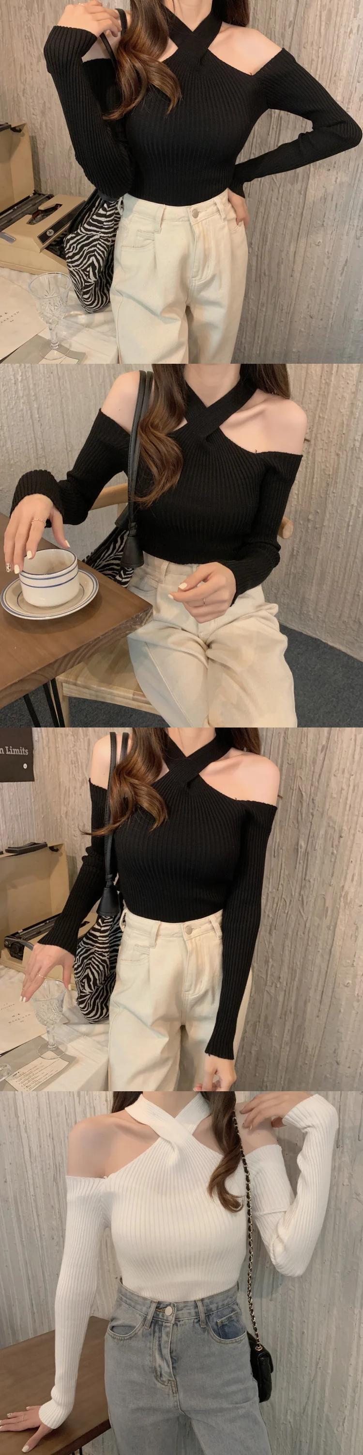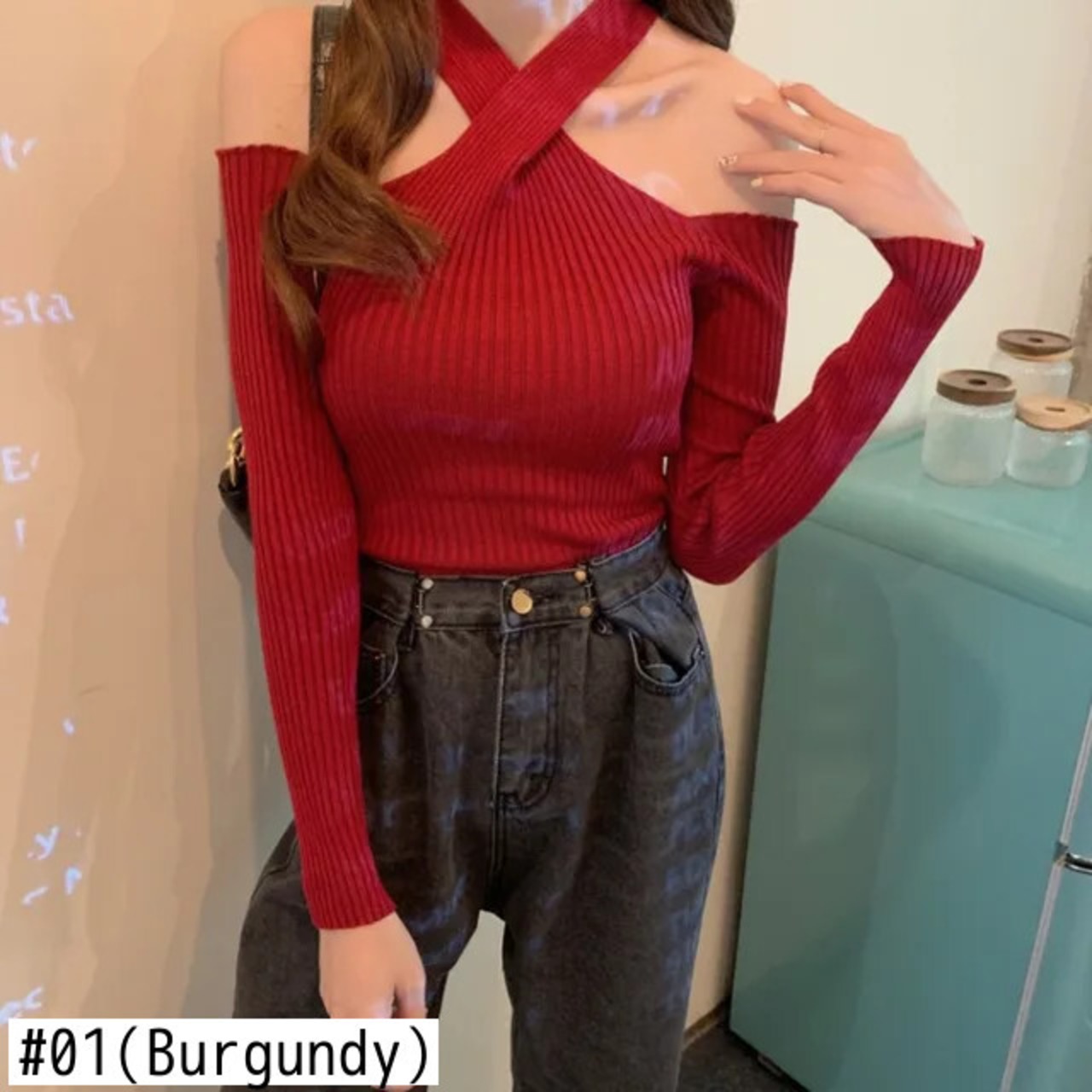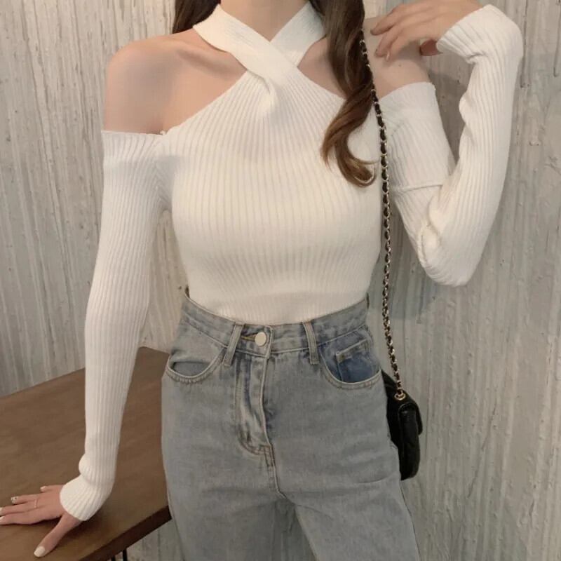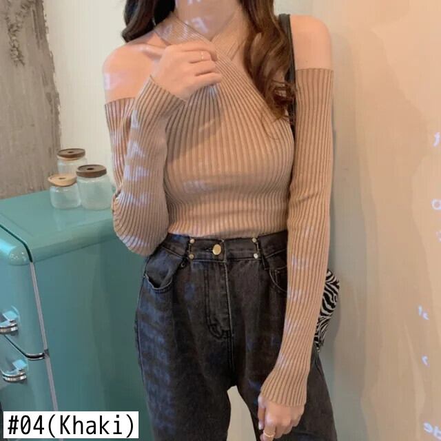 送料無料 秋のセクシーなオフショルダー長袖ニット女性セーター十字ホルターネック底トップスプルオーバー 28634 ロング オータム 秋物 AE665656634326788256