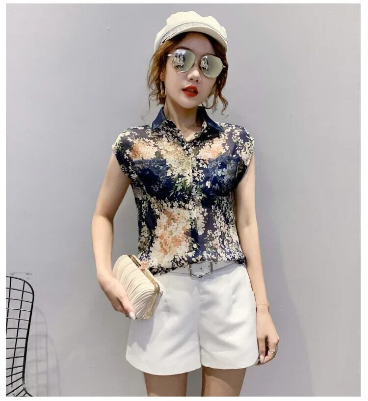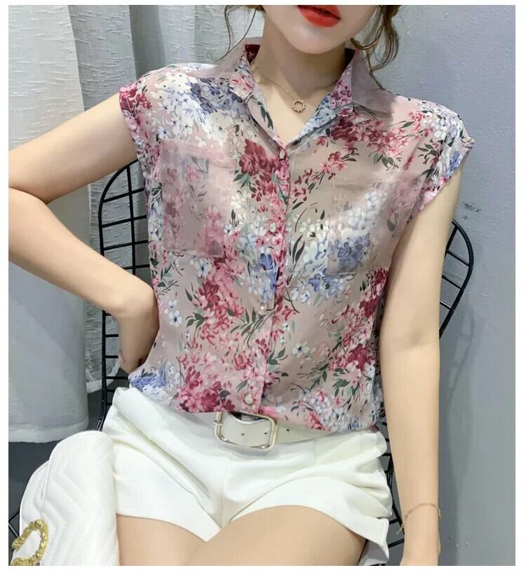 送料無料 サマープリント女性ブラウス花柄シフォンシャツオフィスレディトップスノースリーブ 10225 夏物 会社 学校 通勤や通学にも AE665656626664939240