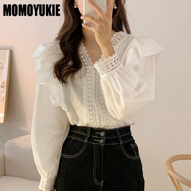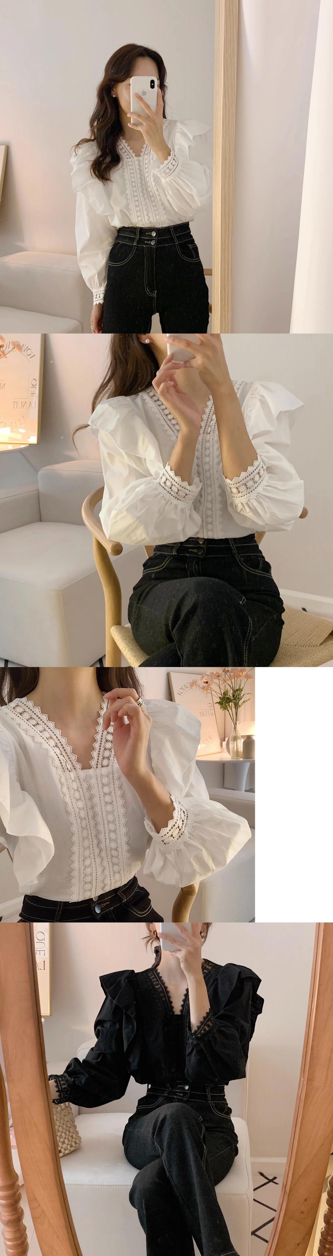 送料無料 2024 Frühling Sommer Frauen Blusen Französischエレガント V-Ausschnitt süße Spitze ヴィンテージ Rüschen Solide Laterne Ärmel Tops Büro Dame ソリッドカラー ビンテージ AE55455470227675901