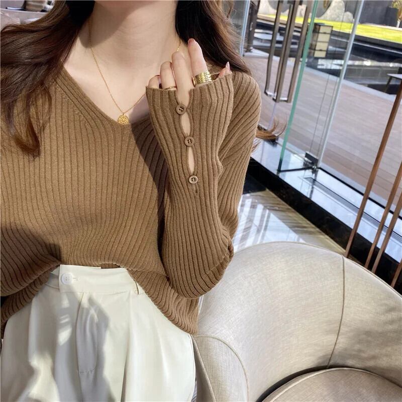 送料無料 Frauen Langarm gestrickt Basis Shirt 2024 Herbst Winter lässig los vielseitige V-Kragen Mode aushöhlen プルオーバー ziehen ウィンター 冬物 AE55455424043132514 | 女性の為の通販サイト-fashion navi