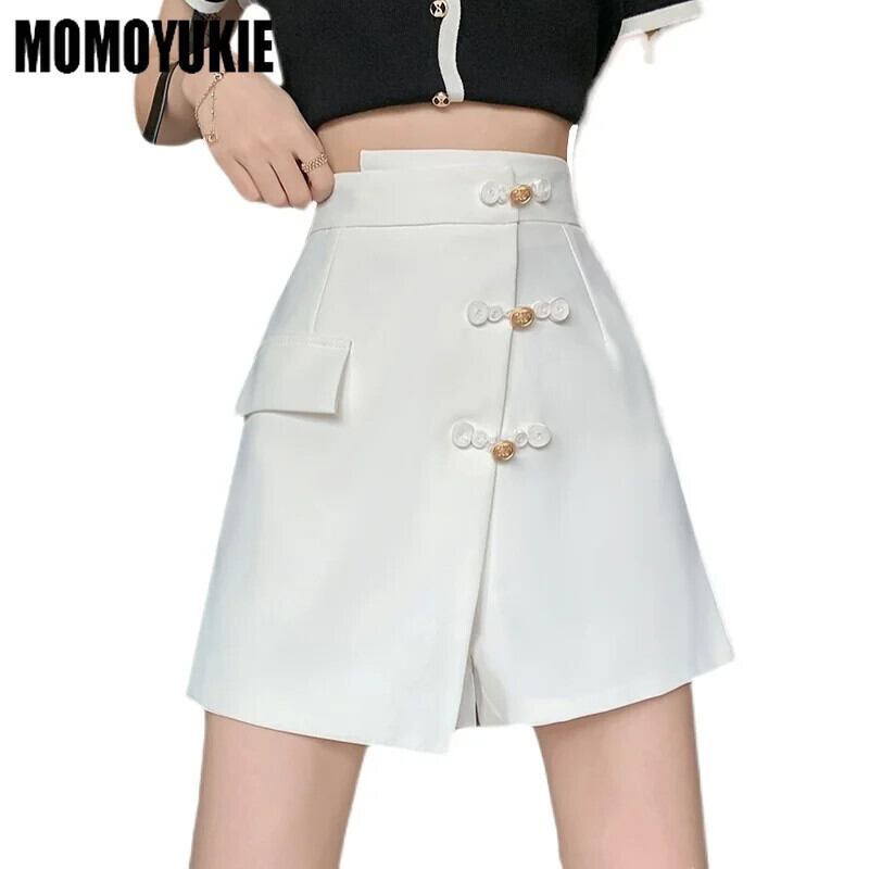 送料無料 Damen hohe Taille lässig vielseitige ショーツ 2024 Frühling Sommer Damen einfarbige Knöpfe unregelmäßig neuen Stil Büro Dame kurz ブルマー AE55455477122020787