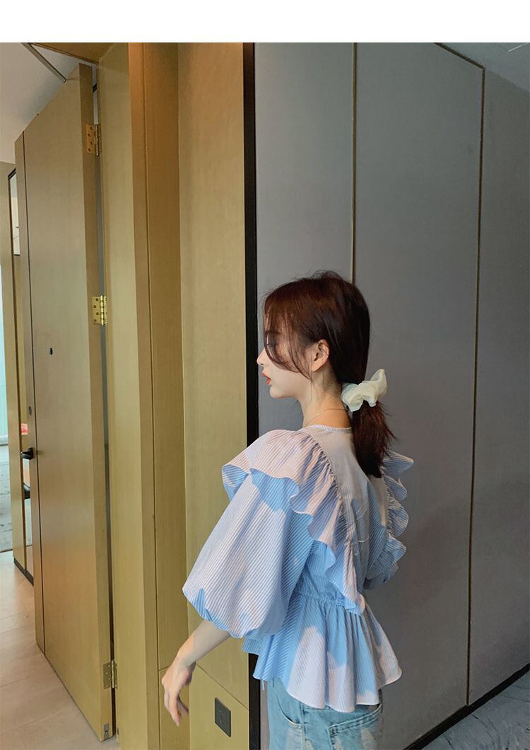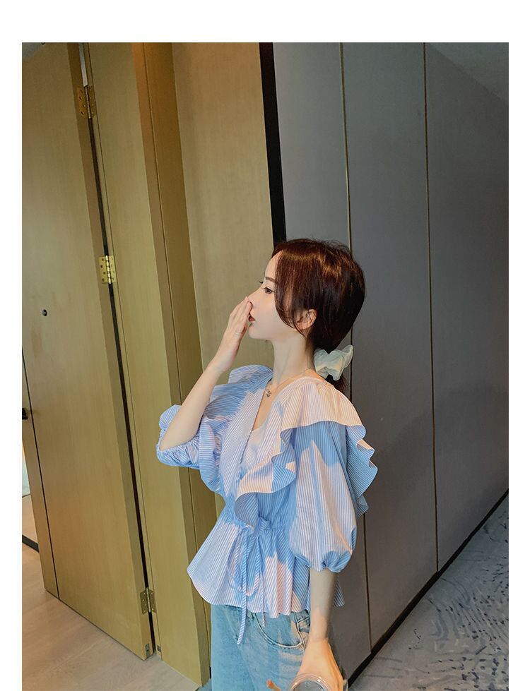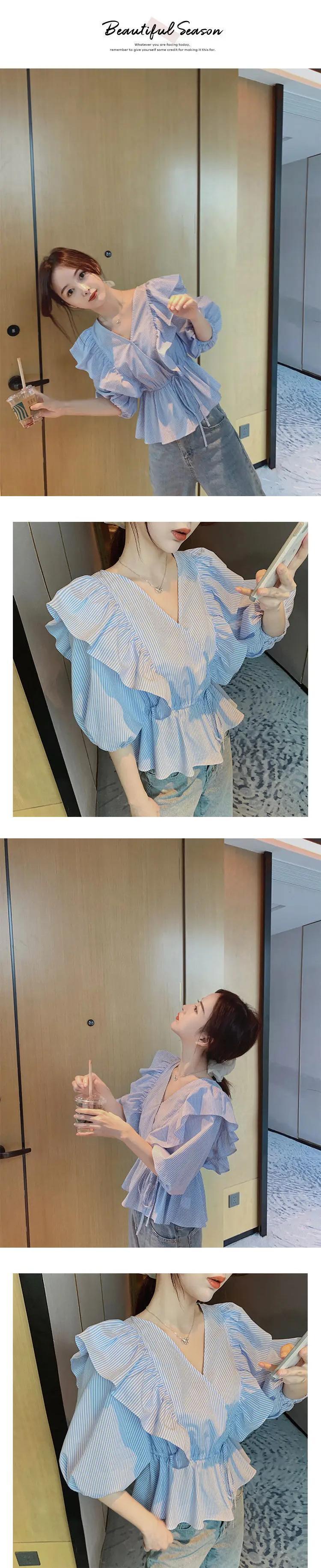 送料無料 2022 frauen Sommer Neue Mode レトロ V アウシュニット シャツ Weibliche ische Rüschen Taille-Gesteuert Gestreiften Chiffon-Halbe Hülse トップス Blusen シフォン AE55455499998064539