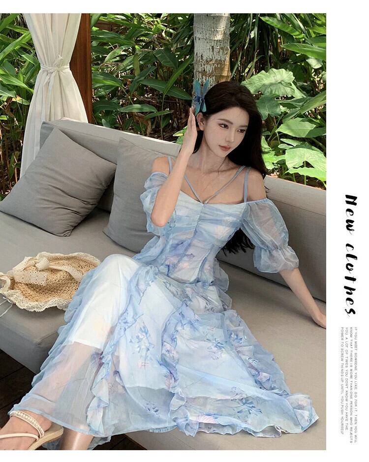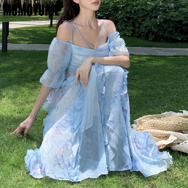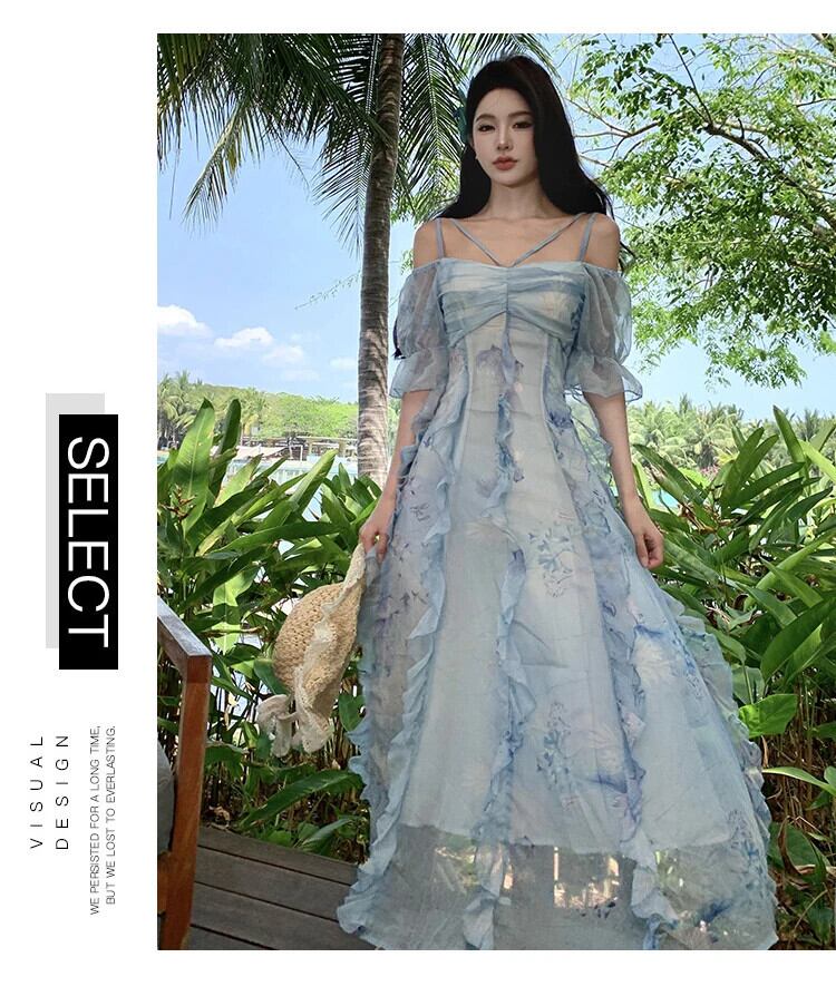 送料無料 2024 Zomer Vrouwen Jurk Franse Vintage Nieuwe Mode Bloemen オフショルダー Korte Mouw Boho Ruche Edge Avondfeest Lange Jurk ビンテージ AE55455472479640735