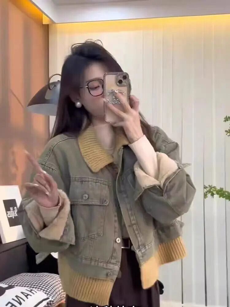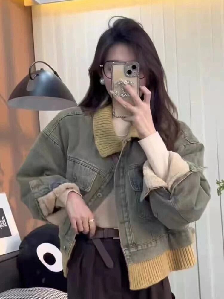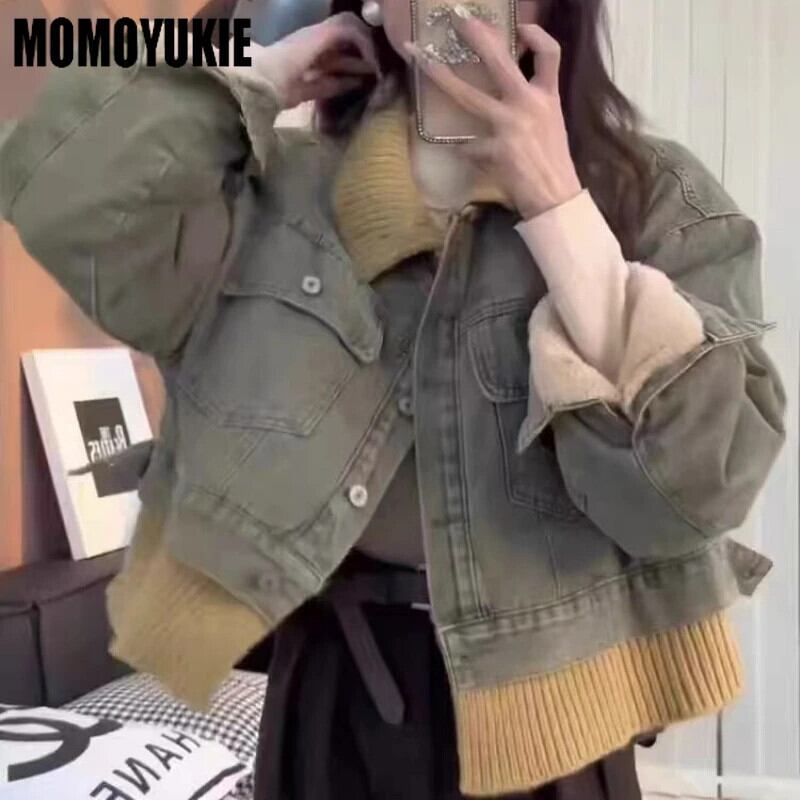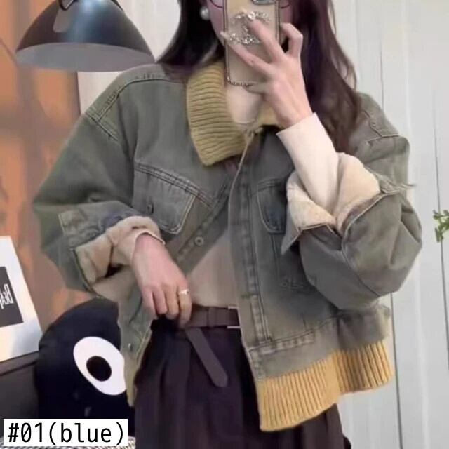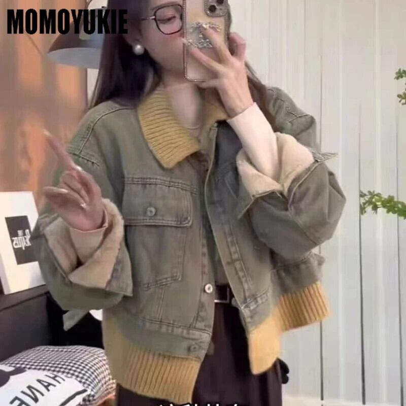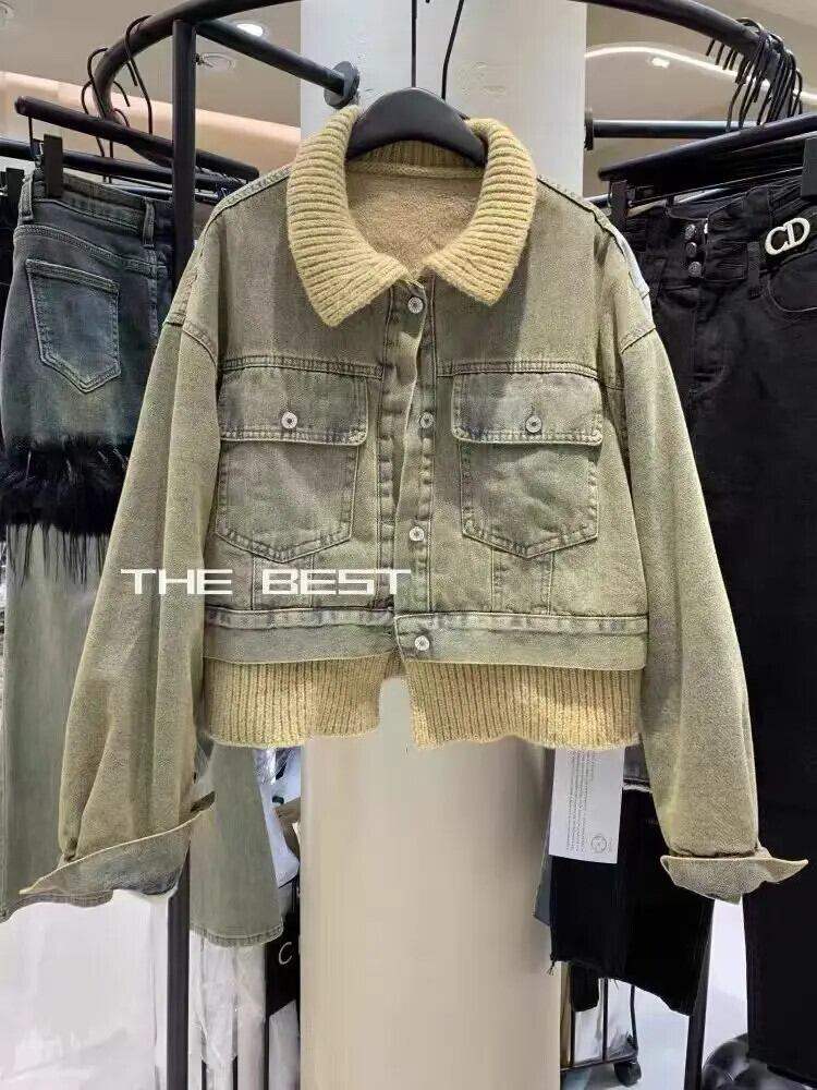 送料無料 女性、フェイクデニムコート、フリースジャケット、ラペル、ショートトップ、ニットパッチワーク、秋冬、新シーズン、2024 AE55455456444306455