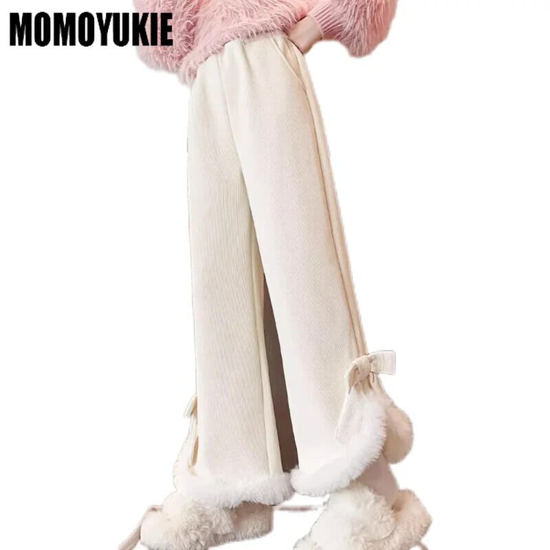 送料無料 Frauen Breite Bein Hosen 2024、Herbst Winter ischen Stil Hohe Taille Süße Plus Samt Warme Verdickung Zarte Mode Freizeit ウィンター 冬物 AE55455437814002408