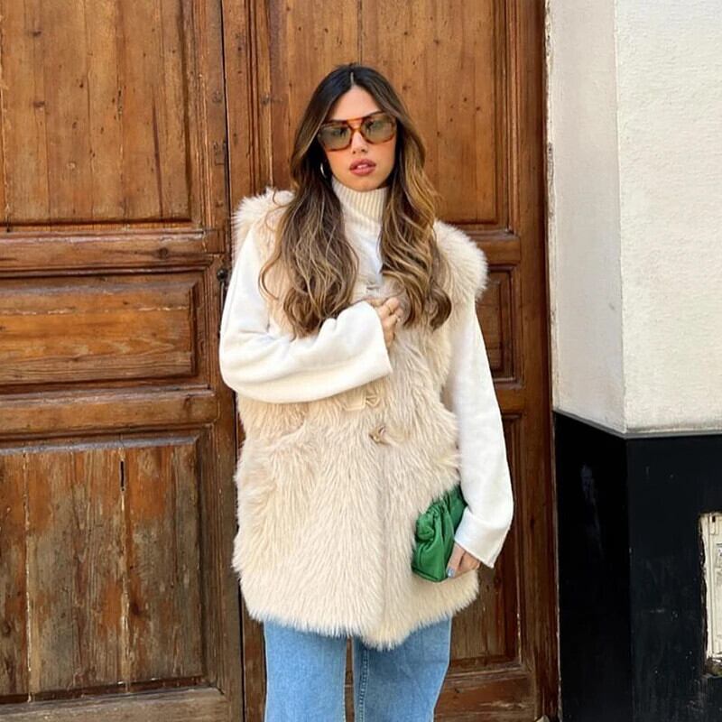 送料無料 Merk Hoornknopen Lange Faux Nertsen Bont Vest トップス Dames Winter Mouwloze Overjen Luxe Dames Shaggy Vest Gilet Casaco ウィンター 冬物 ファー AE667767635008242641