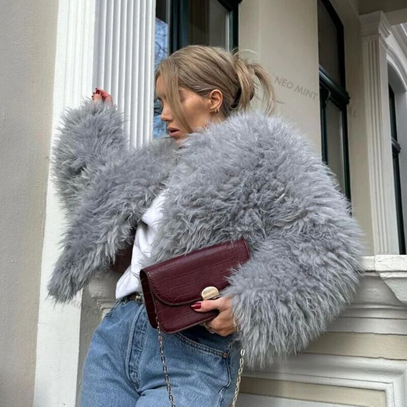 送料無料 Neo Minze exklusiv 2024 Winter Ins heiße Marke Blogger Mode Fuzzy Cropped Kunst pelz Frauen Schicke ストリートウェア Mädchen Lamm Pelz Jacke ウィンター 冬物 AE667767645376701418