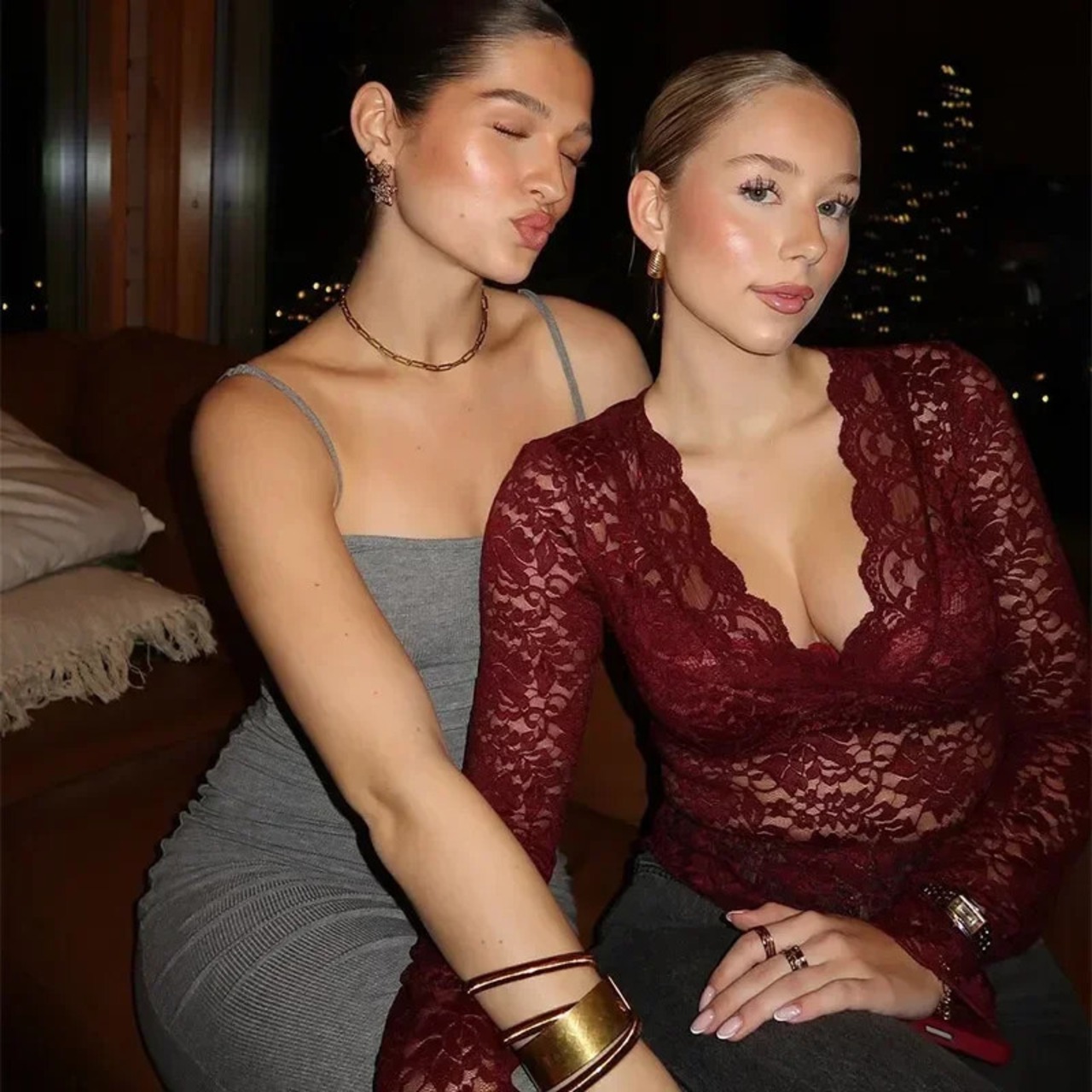 送料無料 Burgund Langarm Spitze トップ Frauen セクシー Durchsichtig スリム フィット Kurzes Hemd Neue Weibliche Chic Party Nacht Club Street Weste ストリート AE6776753051239002 | 女性の為の通販サイト-fashion navi
