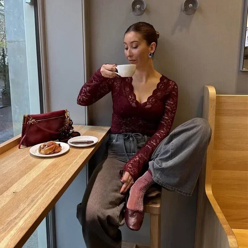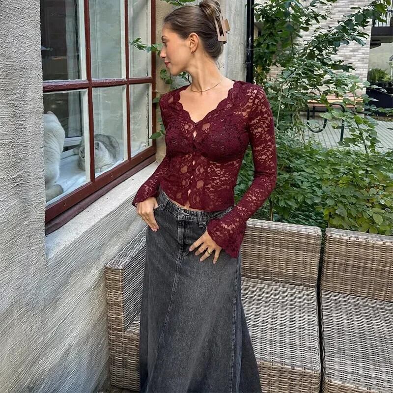 送料無料 Burgund Langarm Spitze トップ Frauen セクシー Durchsichtig スリム フィット Kurzes Hemd Neue Weibliche Chic Party Nacht Club Street Weste ストリート AE6776753051239002