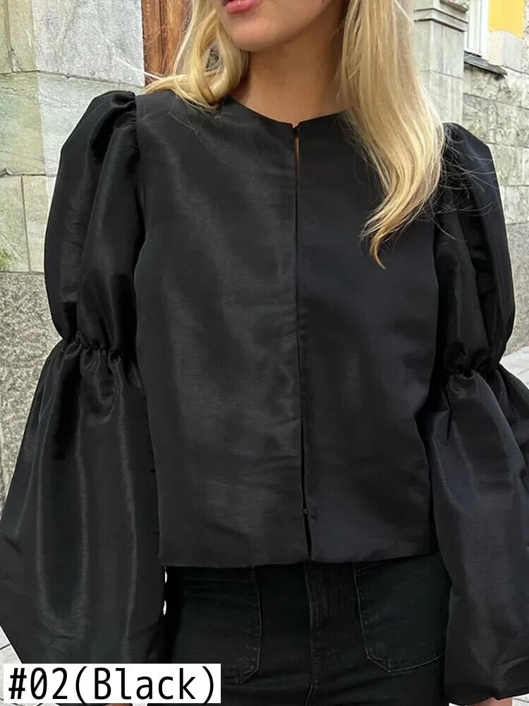 送料無料 Mode frauen Solid Puff Volle Ärmel Satin Bluse と Frauen O Neck Split Cropped Tops 2025、Neue Weibliche Street シャツ ストリート Oネック サテン ソリッドカラー AE6776782833342038 | 女性の為の通販サイト-fashion navi