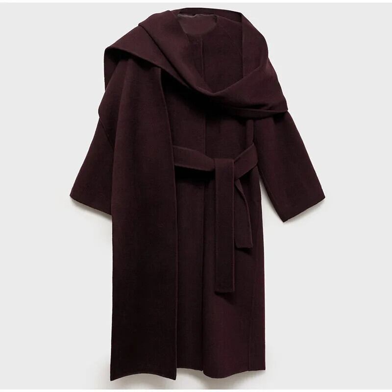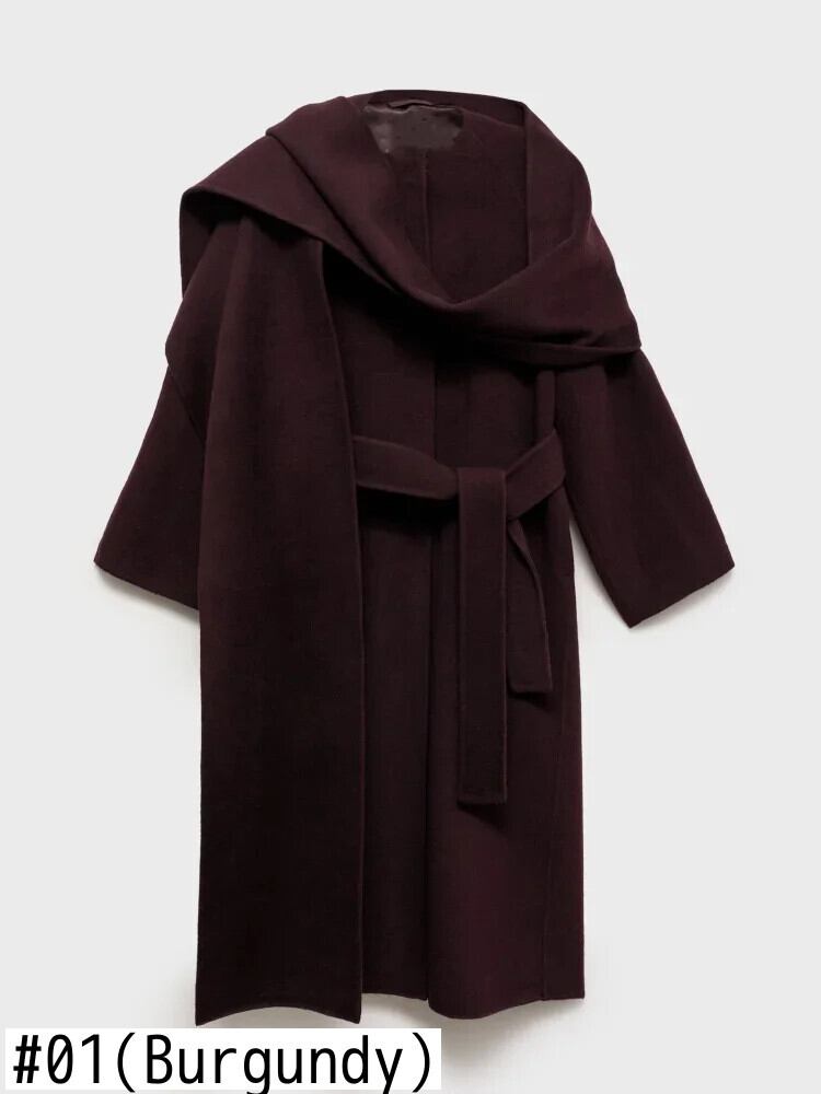 送料無料 2024 Bordeaux Rood e Sjaal Kraag Wollen Overjas Vrouwen Mode Lange Mouwen レースアップ オーバーサイズ Jas Vrouwelijke Chic Bovenkleding AE6776761202977447