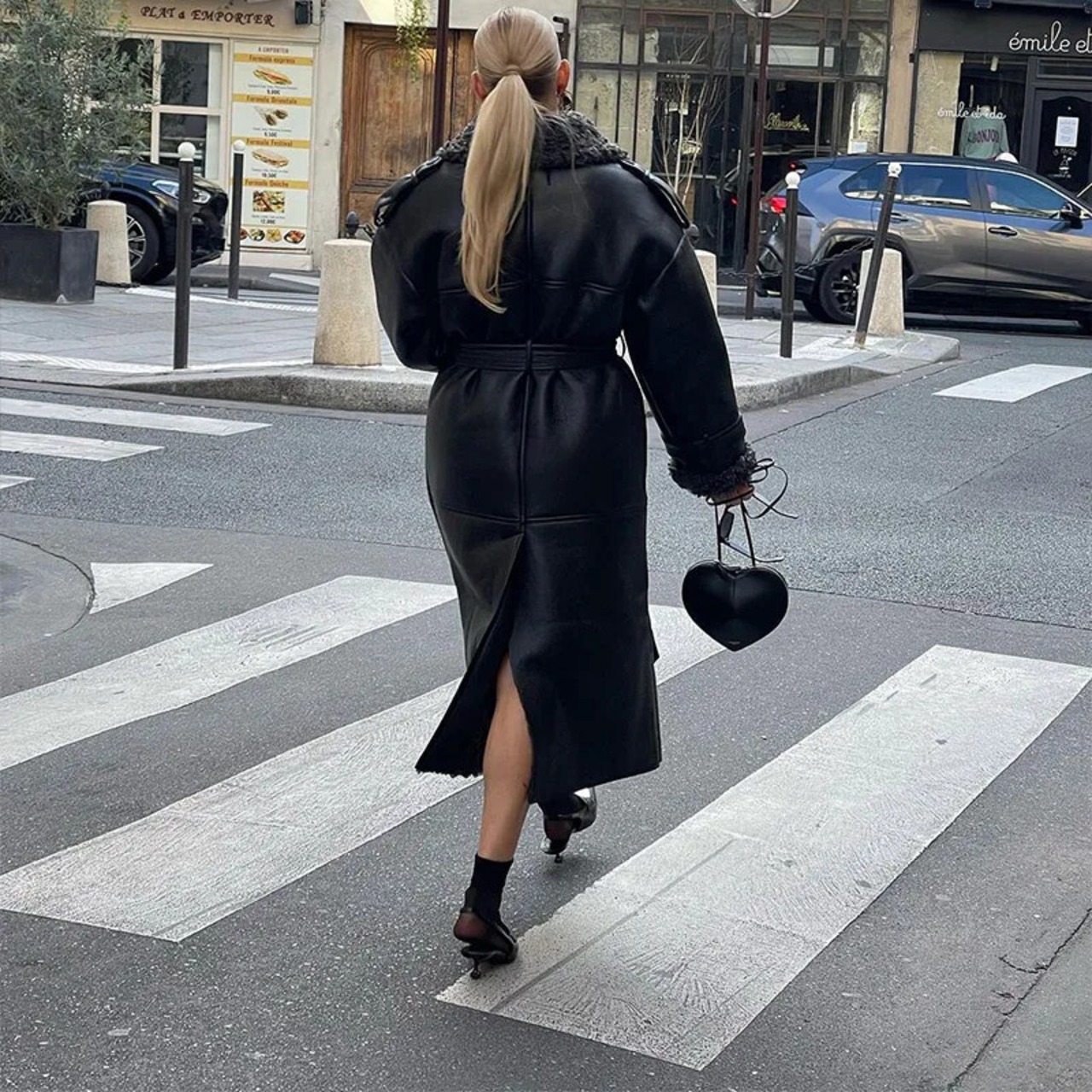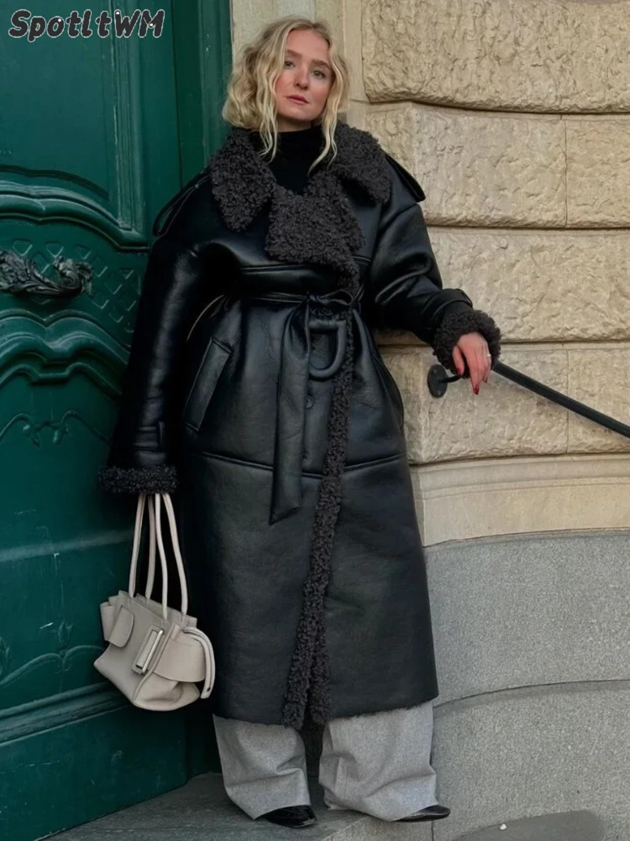 送料無料 Winter Warme パッチワーク Lamm Wolle Leder Lange Jacke Frauen e Revers Mit Gürtel Tasche Übergroßen Mäntel 2024 Neue Dame アウター ウィンター 冬物 AE6776764388996698 | 女性の為の通販サイト-fashion navi