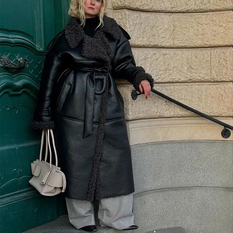 送料無料 Winter Warme パッチワーク Lamm Wolle Leder Lange Jacke Frauen e Revers Mit Gürtel Tasche Übergroßen Mäntel 2024 Neue Dame アウター ウィンター 冬物 AE6776764388996698