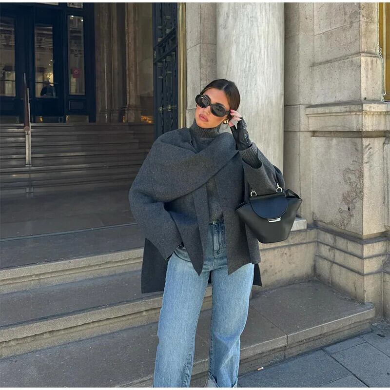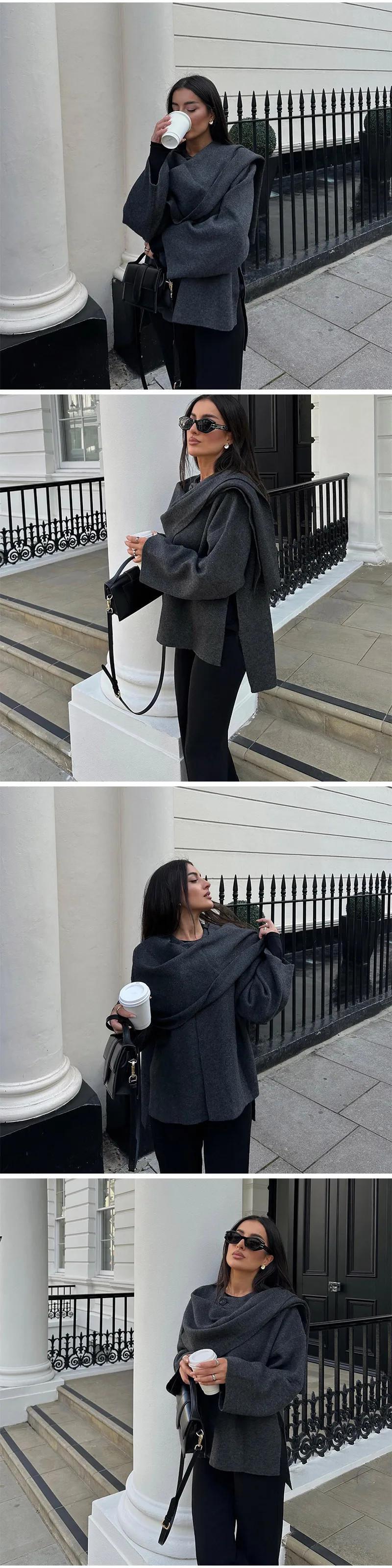 送料無料 2024 Chique Gestreepte Damescolbert Met Sjaal Met Losse Pasvorm シングルブレスト Lange Mouw、Populaire Dames Herfstoutwear AE677678650812807