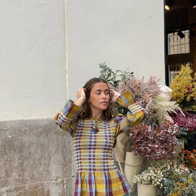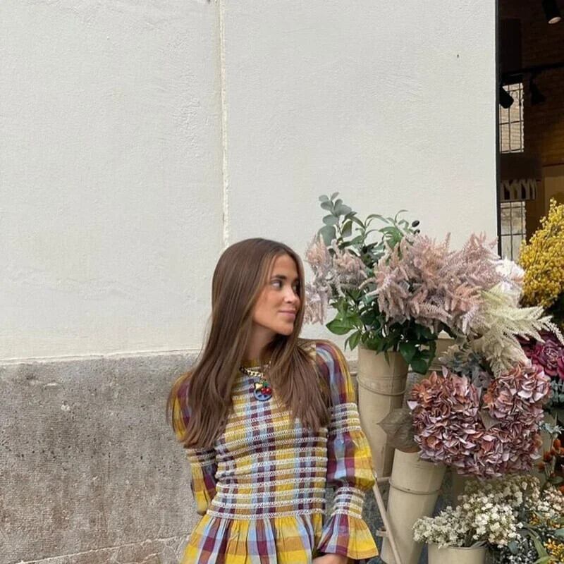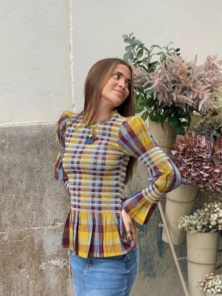 送料無料 Dames Geruite Contrasterende Slanke Pasvorm Pofmouw Tシャツ Geplooide Ronde Hals Korte トップス 2024 Lente Dames Hoge ストリートウェア AE6776797197540340