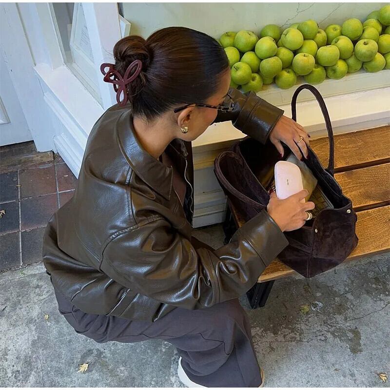 送料無料 Mode Frauen Solide Pu Leder Jacke Chic Revers Lange Sleeve Zipper Taschen Lose Kurze Jacken 2025、Frühling Weibliche Straße Mäntel ソリッドカラー AE6776799470920253
