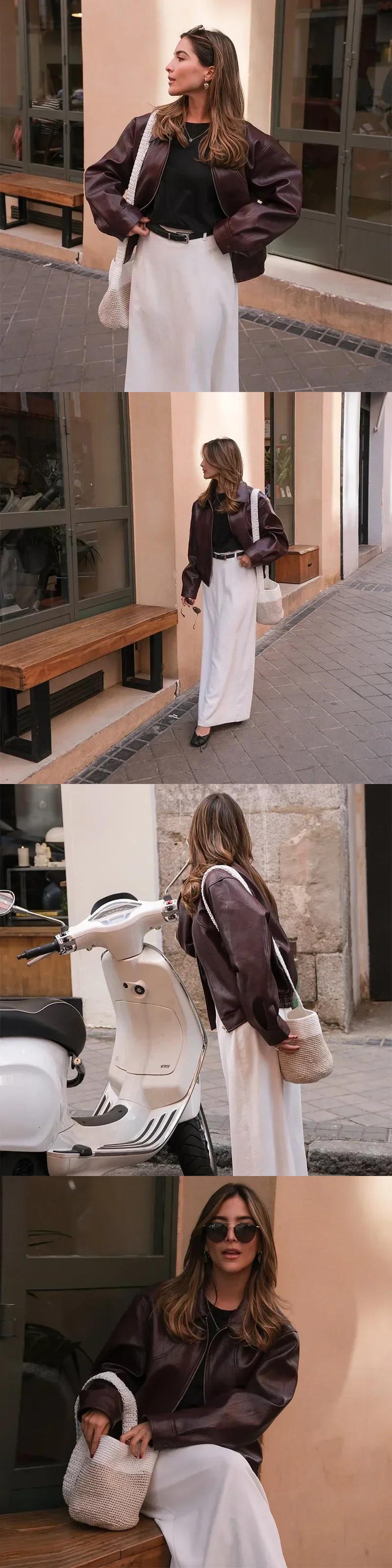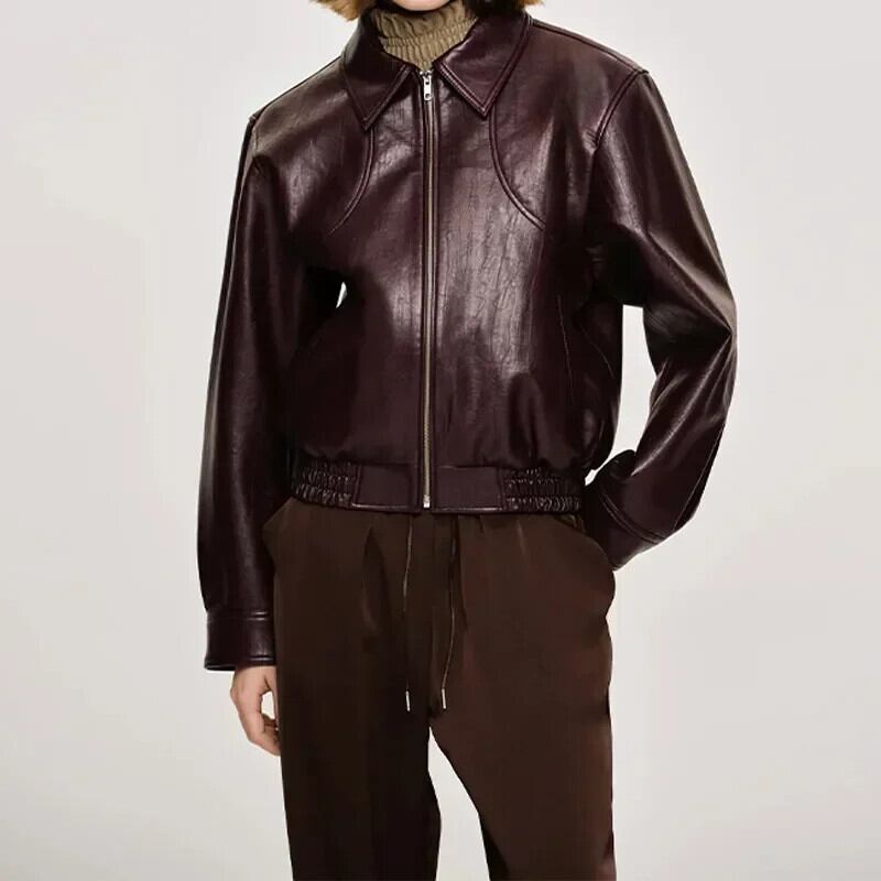 送料無料 e Frauen Solide pu Leder kurze Jacke schickes Revers lange Ärmel Reiß verschluss Ernte Mäntel Herbst Mode Dame Pendeln Straßen oberteile ソリッドカラー AE6776761761466062