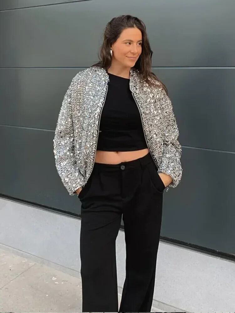 送料無料 ブルゾン Bombardier Élégant à Paillettes Brillantes pour 、Fermeure Éclair、Manches sulf、Col Rond、Commbinaison Courte de Printemps、Vêtements d'Extérieur de ixde Rue、Nouvelle Collection 2025 AE677674085416667